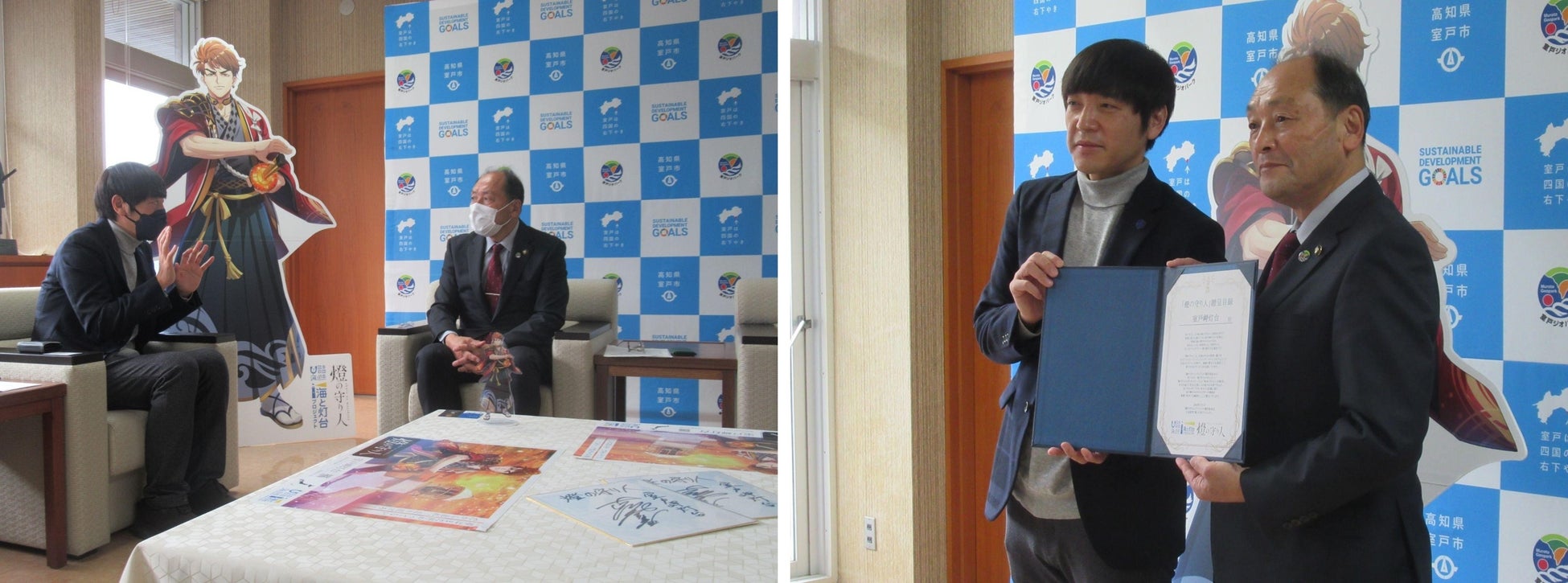 高知県室戸市「室戸岬灯台」を擬人化したキャラクターが完成!「燈の守り人」製作委員会プロデューサーが植田壯一郎市長を表敬訪問しキャラクター贈呈式を実施しました