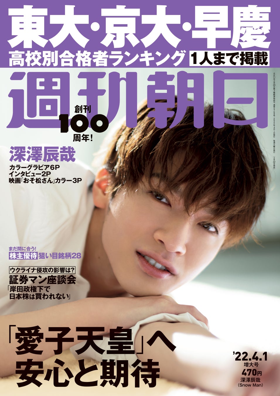 今週の「週刊朝日」は、Snow Manの深澤辰哉さんが表紙とカラーグラビアを飾ります。グループ最年長で、よどみなくトークを回すMC担当。自身の容貌をネタにする“いじられ三枚目キャラ”で、3月25日公開の実写映画「おそ松さん」で演じる“無気力マイペースな四男・一松”についても、「共通点は二つで、ジト目と猫背です」と笑いを誘いますが……インタビューでは、一松とは違う側面に迫りました。「おそ松さん」の“未完成報告会”の様子を報じたグラビアでは、Snow Manのメンバー全員が登場します。他にも、成年後初めての会見で高まる「愛子天皇」待望論、東大・京大・早大・慶大の結果を一挙掲載する大学合格者高校ランキング、早慶、上智、東京理科・GMARCHの学部別ランキング、ロシアによるウクライナ侵攻で激変する国際情勢を受けての証券マン緊急座談会、テレビで「食ドラマ」が次々とつくられる背景など、バラエティー豊かなラインナップでお届けいたします。