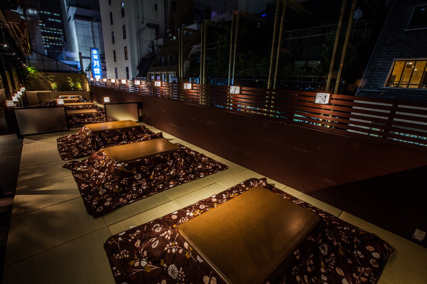 ③都心のビル群に囲まれた解放感抜群の『こたつテラス』は、非日常的な体験をお楽しみいただけます。