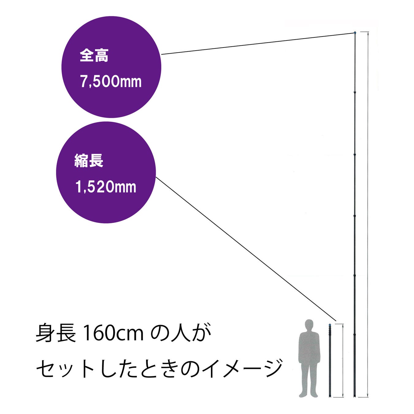 最大パイプ径42mmのカーボンパイプによる6段伸縮により、縮長1.52mから7.5mを実現しました。