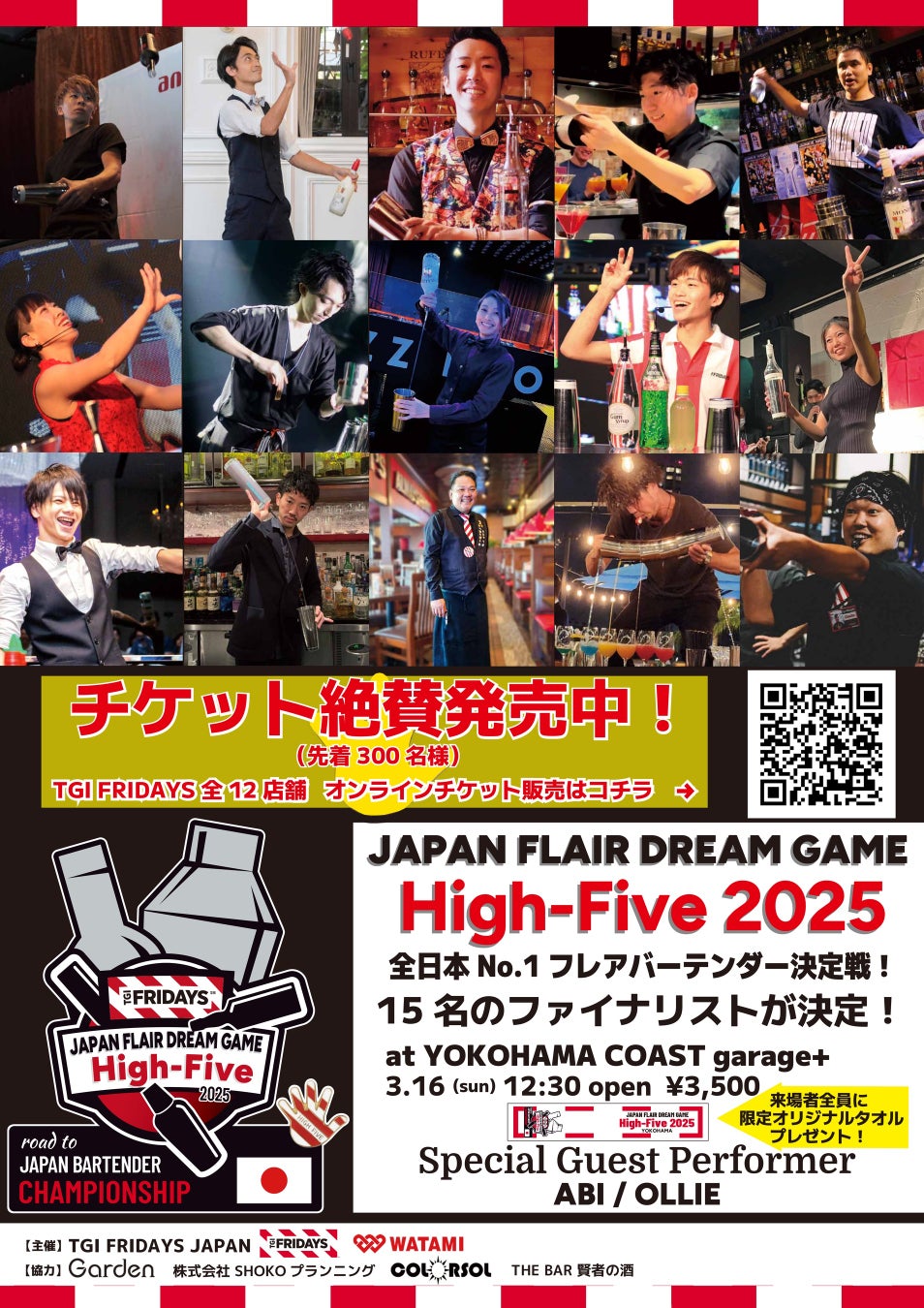 TGI Fridays Japan(本社:東京都大田区/以下:TGI フライデーズ)が、運営する、世界41か国で450店舗以上を展開するグローバルブランドのアメリカンカジュアルダイニングチェーン「TGI フライデーズ」は、2025年3月16日(日)、神奈川・横浜 YOKOHAMA COAST GARAGE+ にて開催される 全日本No.1フレアバーテンダー決定戦 『JAPAN FLAIR DREAM GAME High-Five 2025』 のファイナリスト15名が決定したことをお知らせいたします。