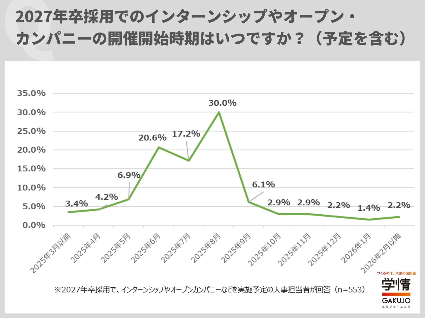 2027年卒採用でインターンシップやオープン・カンパニーを実施する企業に最初の開催時期(予定を含む)を尋ねたところ、「2025年8月」が最多で30.0%に上り、次いで「同6月」20.6%、「同月」17.2%が続き、この3カ月で計67.8%を占めました。夏の3カ月に集中しており、同9月以降は一桁に急落します。同5月以前の開催も計14.5%ありました。