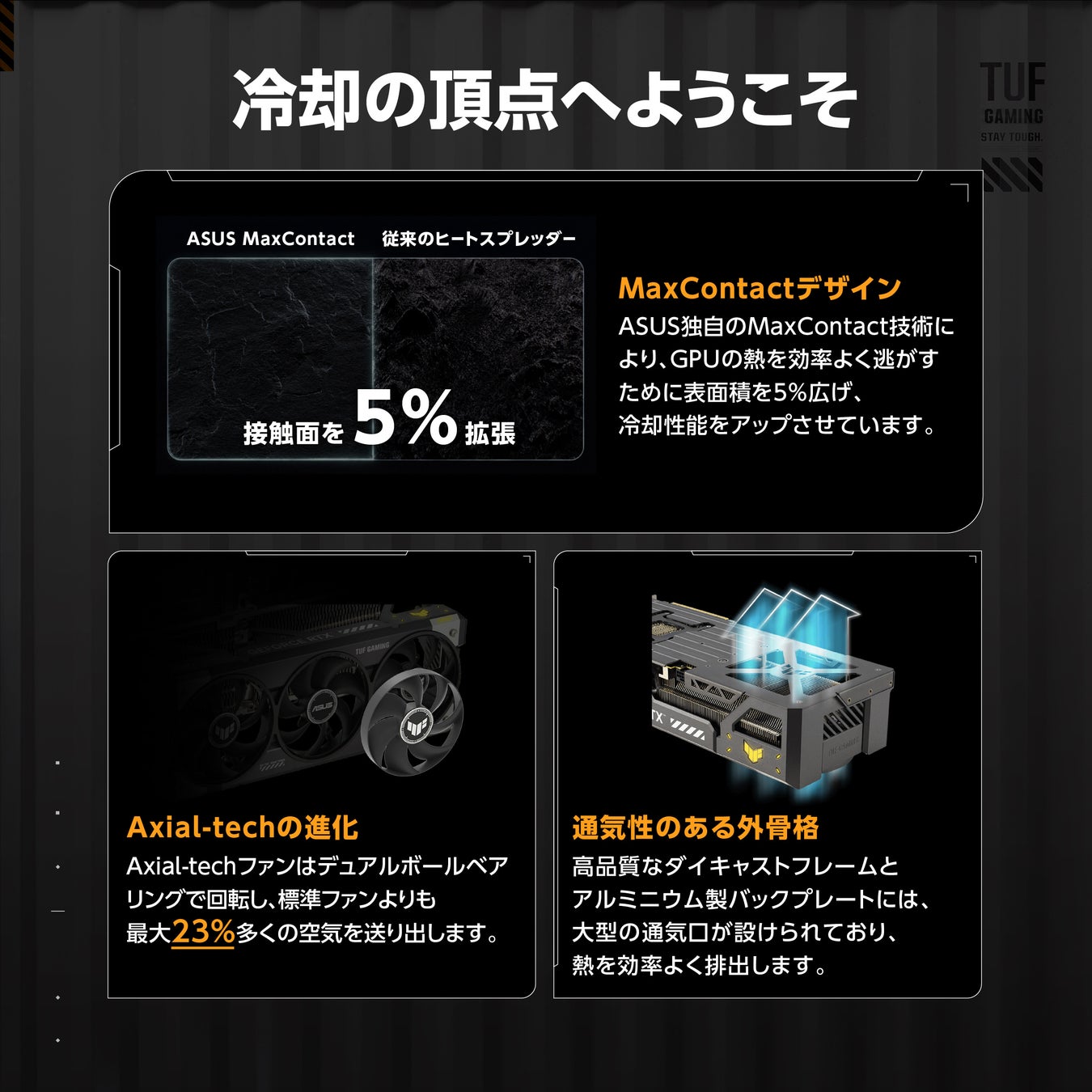 ASUS独自の製造プロセスで、GPUのヒートスプレッダの表面積を5%拡大。強力なヒートシンクとAxial-techファンと組み合わせることで、最大2°Cの温度改善を実現。