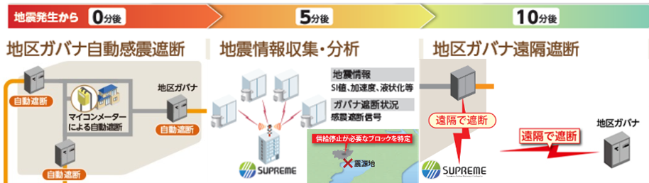 各センサーからリアルタイムに取得した情報を「SUPREME」に連携することで、被害エリアでの迅速なガス供給停止と安全なエリアへのガスの安定供給を両立することができます。