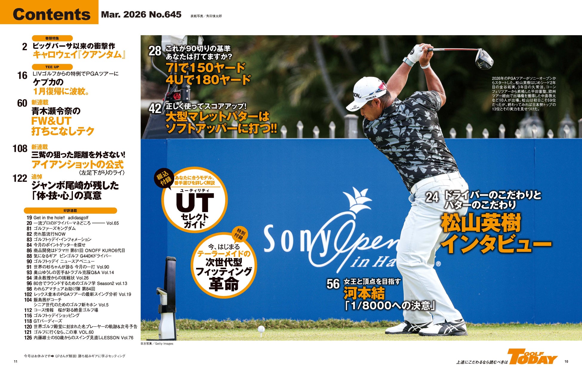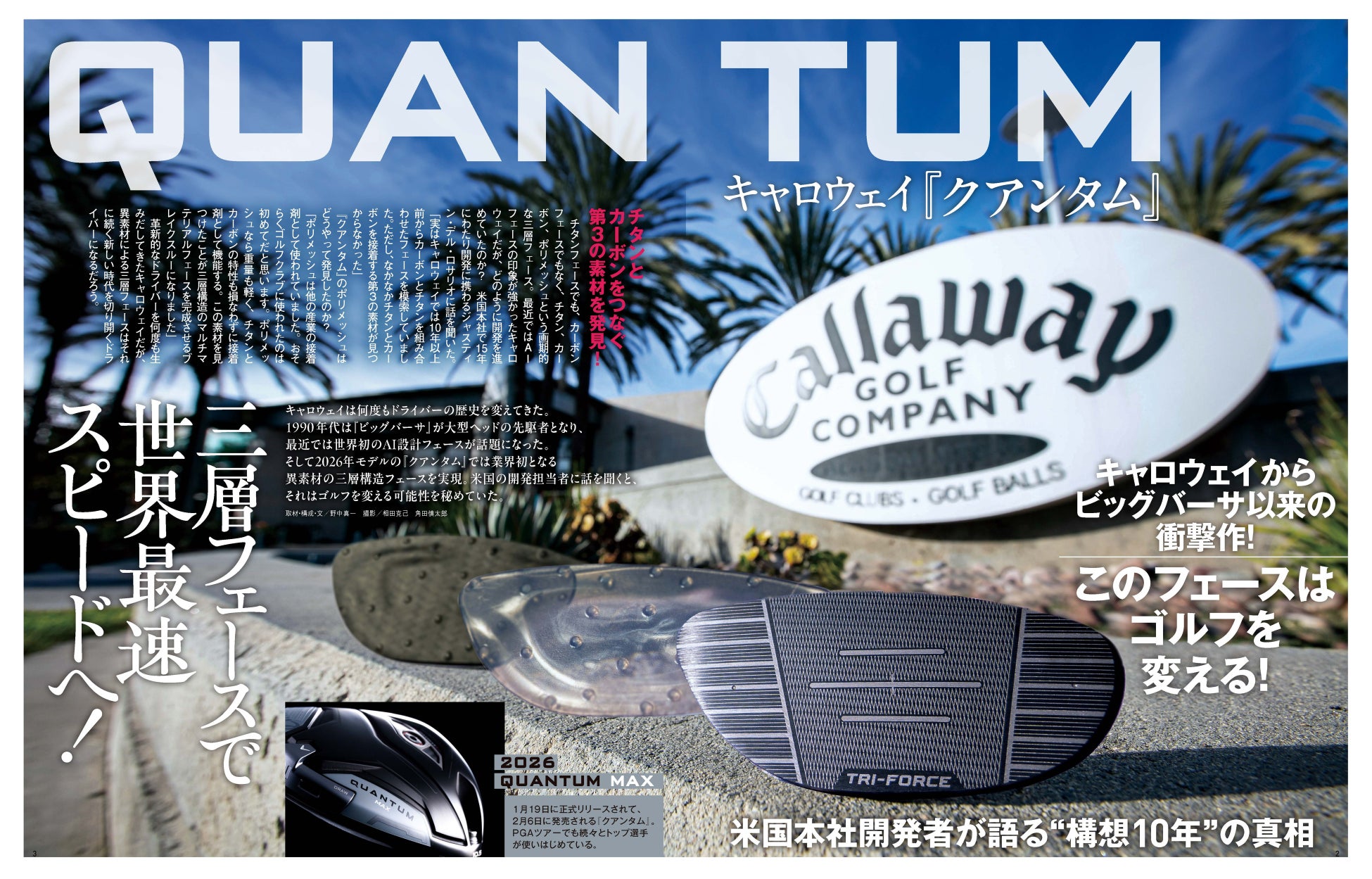 GOLF TODAY3月号は、キャロウェイゴルフ契約プロの石川遼、河本結、河本力の3人がそろった撮り下ろし表紙から始まります。巻頭では、3人が実際に使用するキャロウェイの最新クラブ「QUANTUM」を特集。プロが感じた性能や特徴を通して、その進化をわかりやすくお届けします。