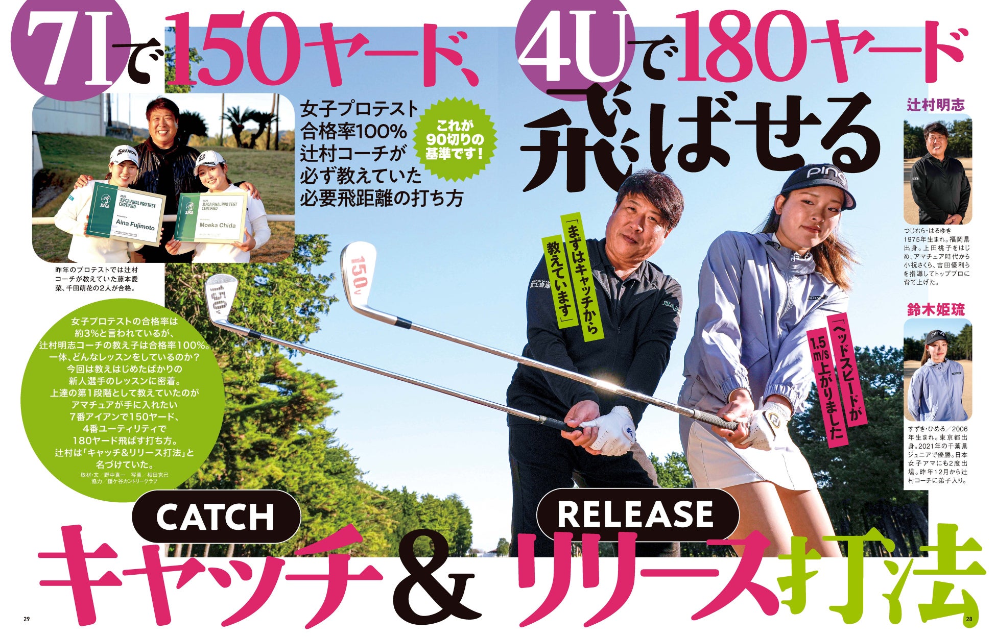 巻頭技術特集では、90切りを目指すゴルファーにとって一つの目安となる「7番アイアンで150ヤード」「4番ユーティリティで180ヤード」の距離を打つ、をテーマに、辻村明志コーチが解説。力に頼らず、再現性を高めるための考え方が学べます。