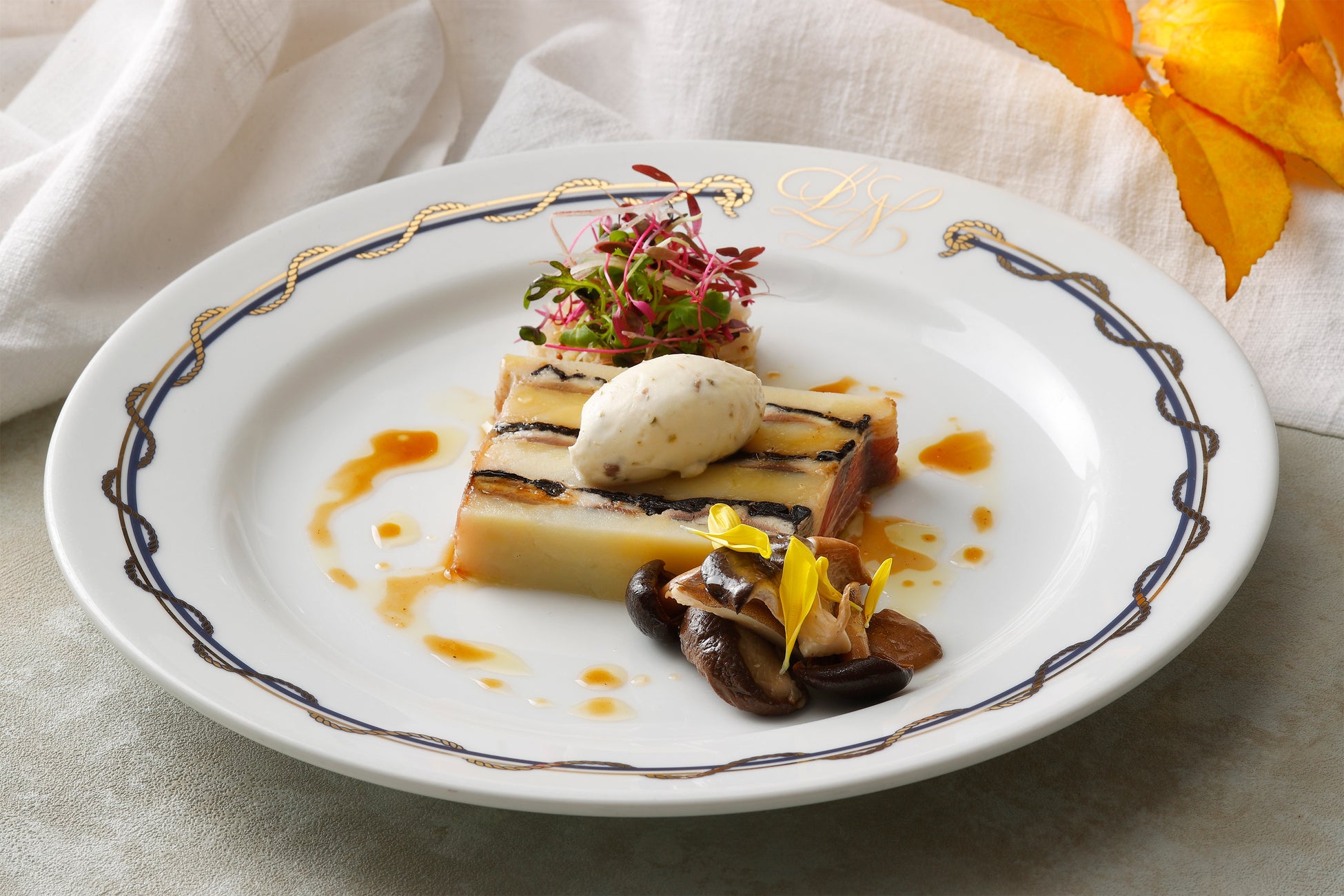 黄金色に色付く秋の景色をイメージした前菜「イワシと男爵芋のテリーヌ ベーコンの香り シュークルートと茸のマリネ添え」にはじまり、香り豊かなスープ「マッシュルームのポタージュ カプチーノ風」など、メインディッシュはお好みに合わせて4種類よりお選びいただくコースと、フルコースをご用意しました。澄み渡るパノラマビューの景色とともにお楽しみください。