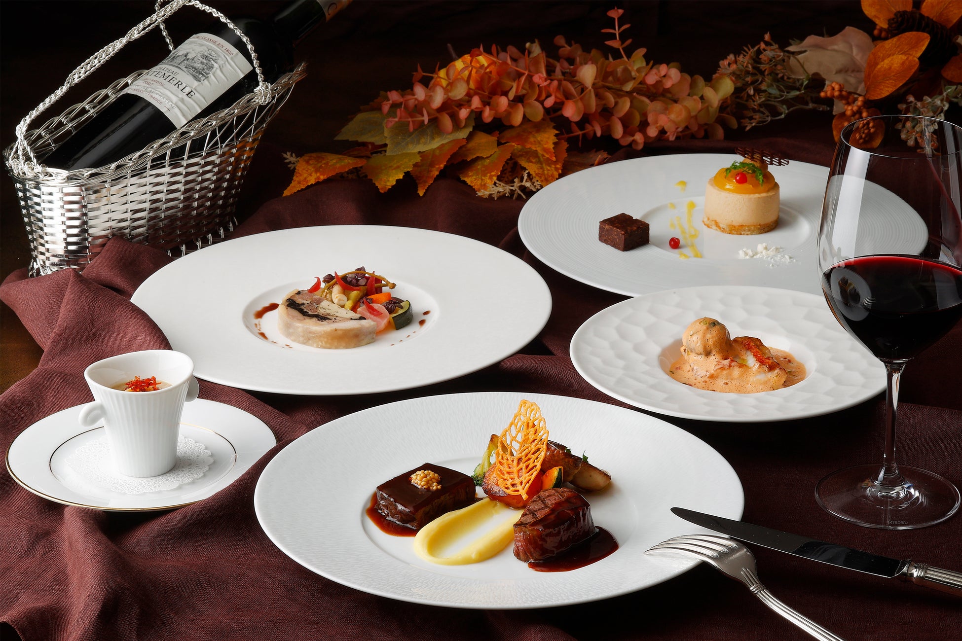フランスで“キノコの王様”と称される滋味深いセップ茸を使用した前菜「セップ茸のなめらかなヴルーテ ヘーゼルナッツとチョリソ」や、ホロホロ鳥、フォアグラ、トランペット茸を使用した濃厚でコク深い味わいが口いっぱいに広がる「岩手県石黒農場産ホロホロ鳥と里芋・フェアグラ・トランペット茸のガランティーヌ」、メインにおすすめしたいのは国産牛のフィレ肉と牛ホホ肉のワイン煮込みの2種の味わいをご堪能いただける「食いしん坊の一皿 国産牛肉を2つの調理法で」など、美食の秋をご堪能いただける品々をフルコースでご堪能ください。