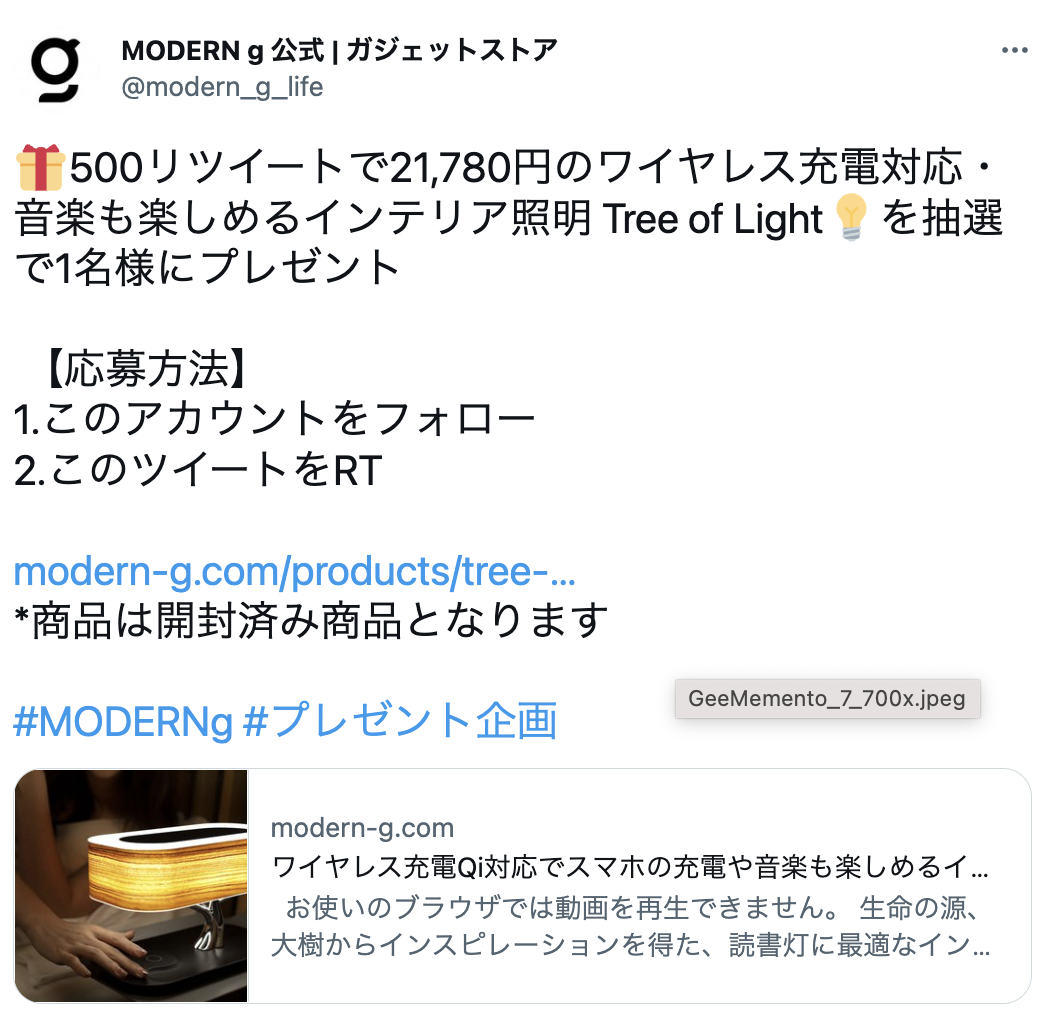ユニークでおしゃれなガジェットを取り扱うMODERNgの公式Twitter(https://twitter.com/modern_g_life)で超お得なSNSキャンペーン中。