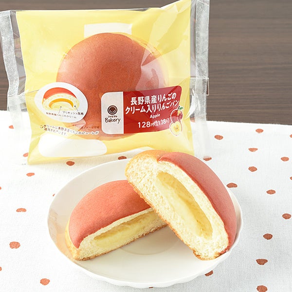 【内容】長野県産りんごのピューレ入りクリームを包んだブリオッシュ生地のパンに、りんごをイメージした赤いビスケット生地をのせて焼き上げました。