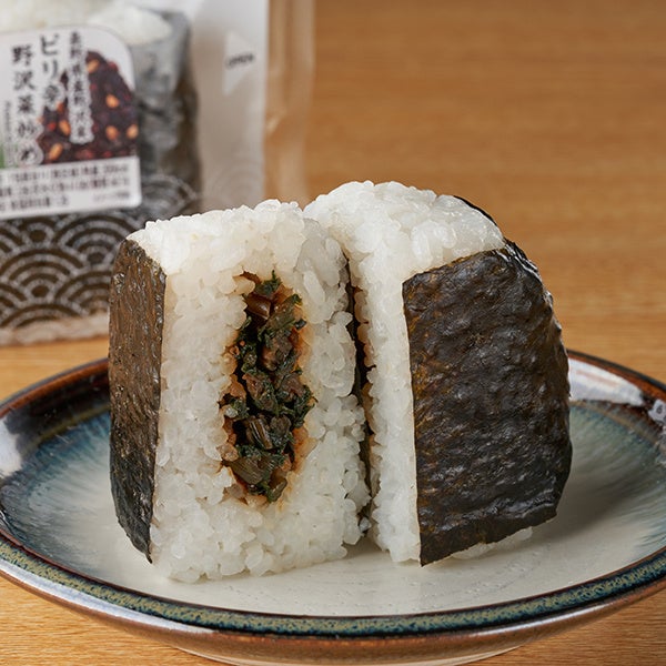 【内容】ごま油とだしつゆで炒めた長野県産野沢菜を使用したおむすびです。味わいのアクセントに、一味唐辛子を配合し、ピリ辛仕立てに仕上げました。