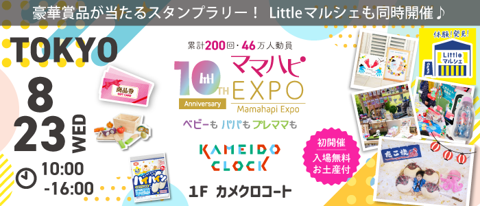 子育てママからの口コミ多数「斬新でビックリ」「イヤイヤも減って助かる」と話題の絵本『でんしゃごっこ』など豪華賞品が当たる抽選会も!大人気イベント「ママハピEXPO」をカメイドクロックで楽しもう!