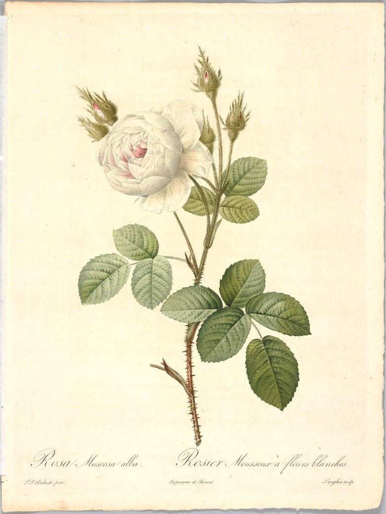 『バラ図譜』に使われる点刻彫版法(stipple engraving)は、輪郭線を可能な限り排除し、きめ細かな色彩の濃淡によって芸術性豊かに描き出すルドゥーテ独特の技法でした。画期的な手法で表現した自然な花々の美しさをお楽しみください。