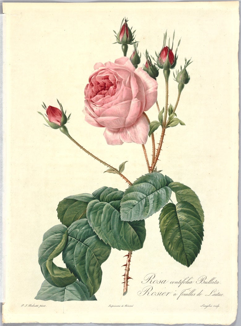 植物学者レリティエとの出会いをきっかけにボタニカル・アーティストの道を歩み始めたルドゥーテは、レリティエの推薦でルイ16世王妃マリー・アントワネットの博物蒐集室付画家と任命されました。フランス革命後、ルドゥーテのパトロンとなったのは、ナポレオン皇妃ジョゼフィーヌでした。「近代バラの母」と呼ばれるほどバラ栽培に熱心だったジョゼフィーヌは、世界中から集めたバラをルドゥーテに描かせました。その結果誕生したのが、ルドゥーテの代表傑作とされる『バラ図譜』です。