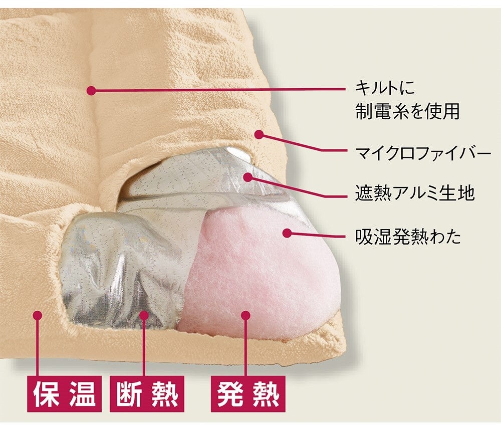 ③マイクロファイバーで肌触りがふわふわ。毛足が長く高密度のマイクロファイバーが空気の層を作って保温。キルトの制電糸で不快な静電気も抑制します。
