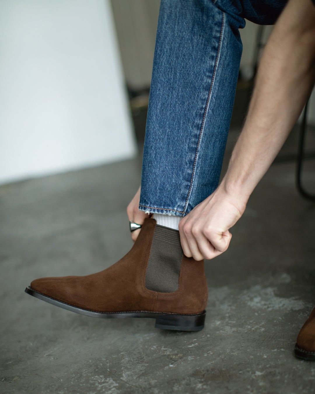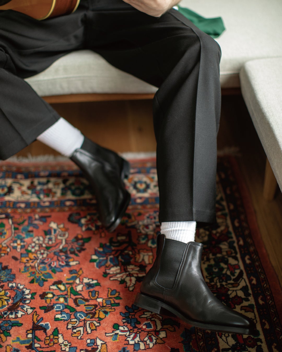 着用時に見える箇所のロゴは廃し、シャープな木型と上質なレザー、そしてグッドイヤーウェルト製法を用いた質実剛健な仕立てにより、上品さと無骨さを兼ね備えたアノニマスなサイドゴアブーツが完成した。礼装靴としての歴史や英国音楽との結びつきなど様々なカルチャーをバックボーンに持つアイテムだからこそ、今履くならこれくらいシックなものがちょうど良い。合わせる服を選ばずに馴染んでくれるから、流行やスタイルに囚われない、自分ならではの履き方がきっと見つかるはずだ。