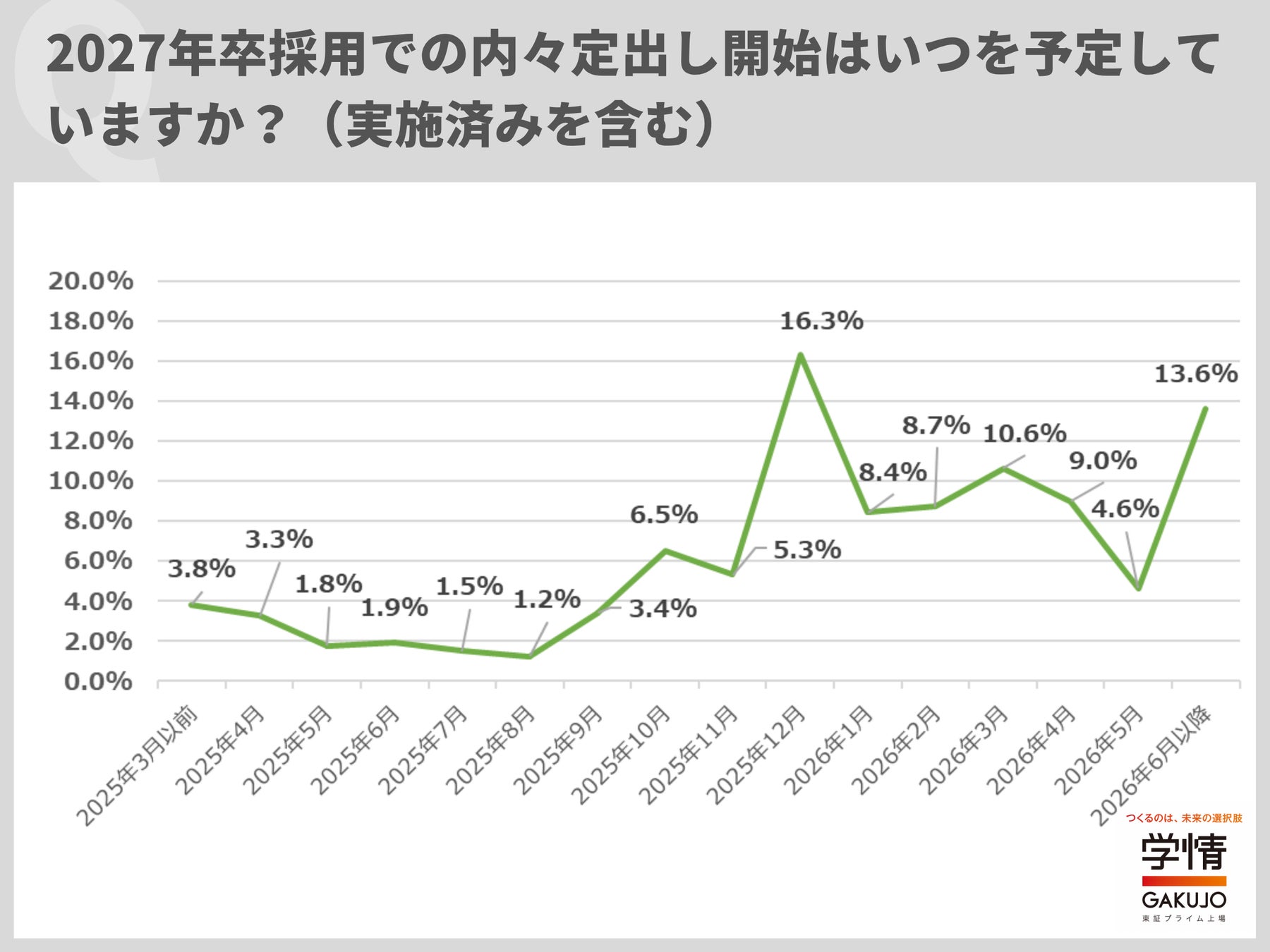 2027年卒採用の内々定出しの開始予定は、「2025年12月」が16.3%で突出しています。年内に一定数の内々定者を確保しようと、内々定出しを12月スタートに早める企業が多いことが分かりました。「同11月以前」を合わせると計45.0%に。半数近い企業が2025年のうちに内々定出しを始める予定です。