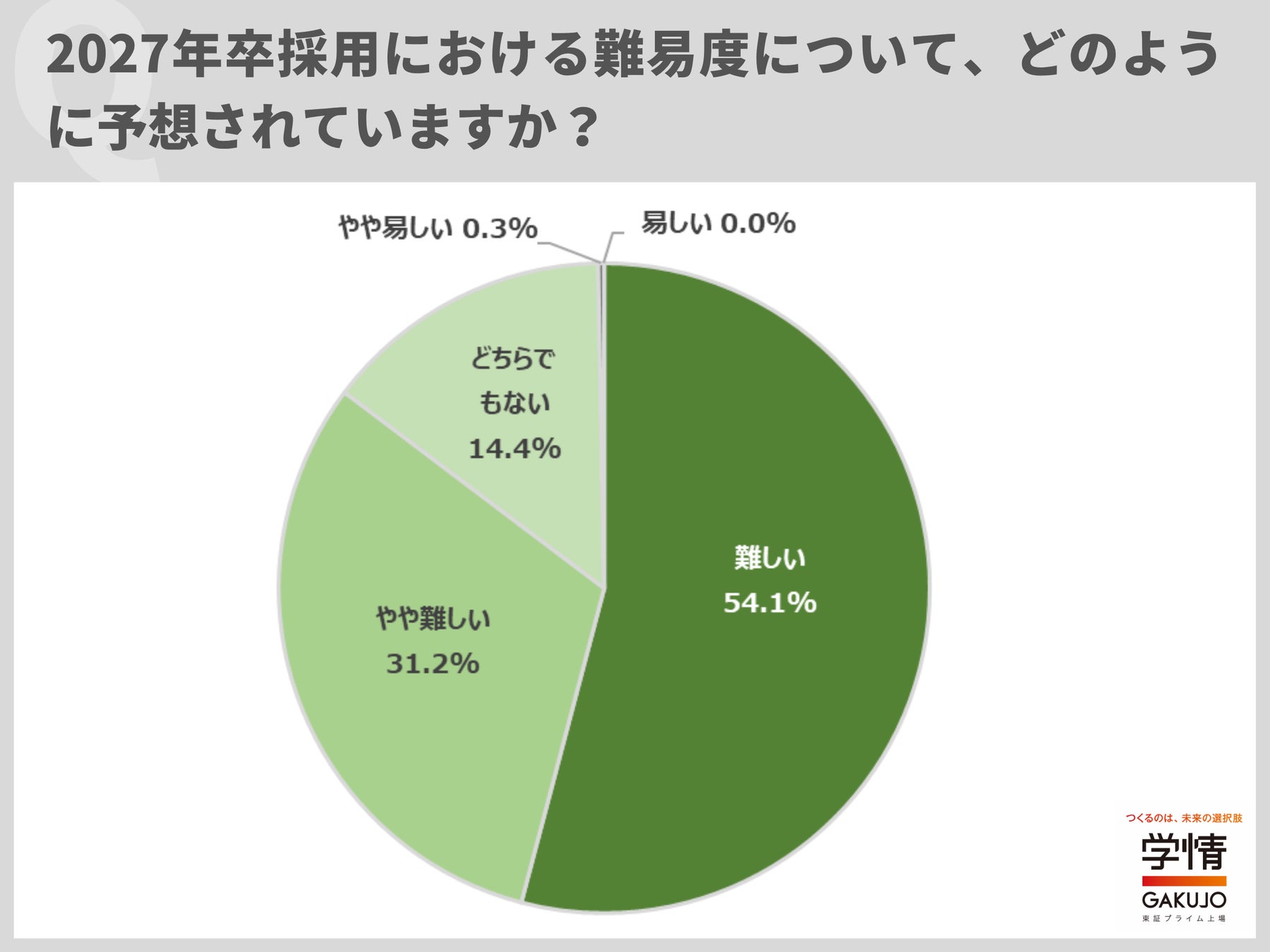 2027年卒採用、難易度アップを予想する企業が8割超。早期化予想は9割に迫る。年内の選考開始予定が6割近く、内々定出し開始は45%