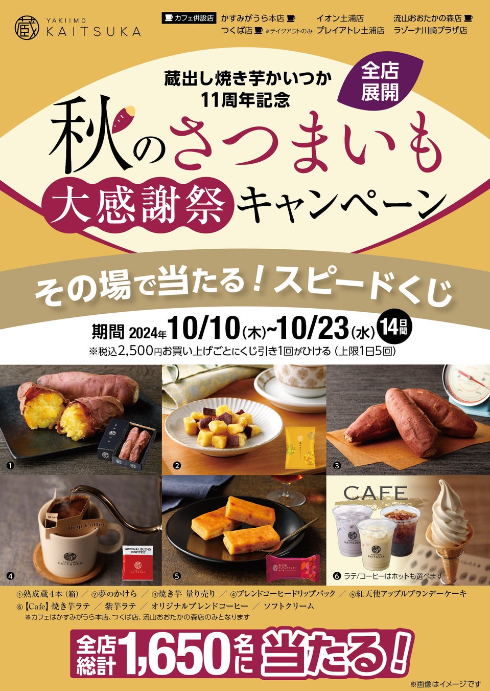 「蔵出し焼き芋かいつか」は2013年春に、1号店をオープンさせてから今年で11周年になります。そこで、さつまいもの日に合わせて、10月23日(水)まで「秋のさつまいも大感謝祭キャンペーン」を展開しております。税込み2,500円をお買い上げいただくごとにくじが1回ひけるキャンペーンで、全店総計で1,650名様に人気商品が当たります。