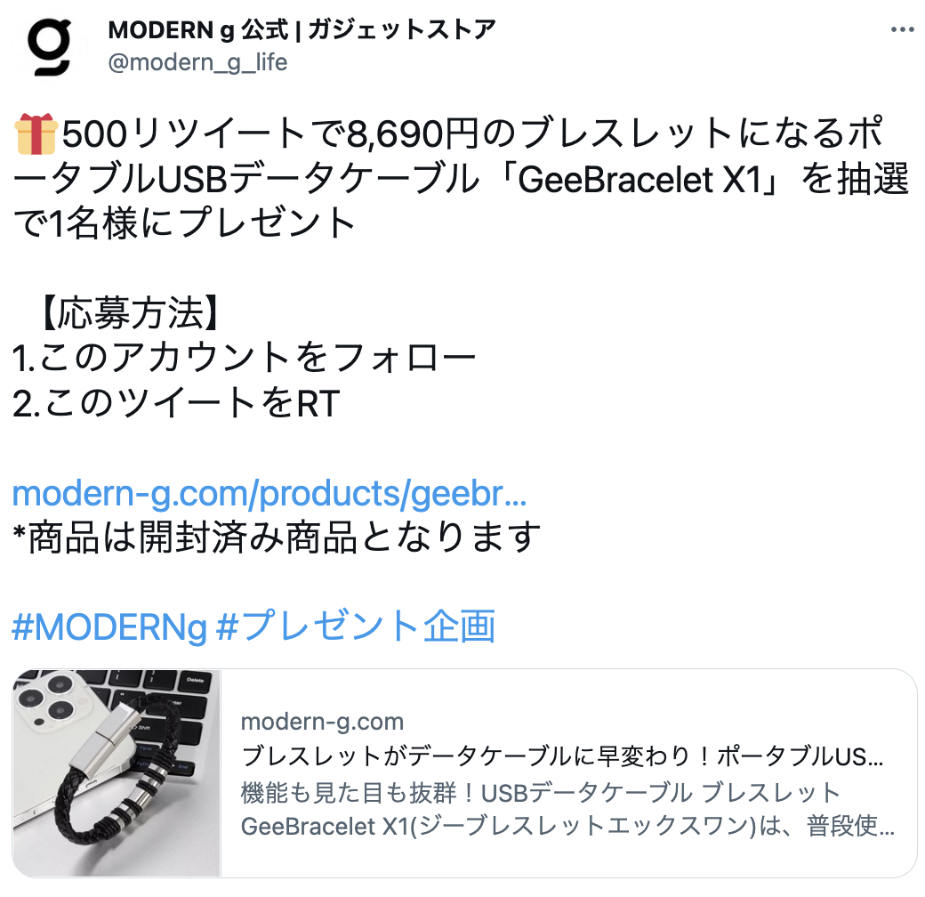 【8,690円のブレスレットになるポータブルUSBデータケーブル「GeeBracelet X1」をプレゼント!】MODERN gの公式Twitterで毎日ギブアウェイキャンペーン中!