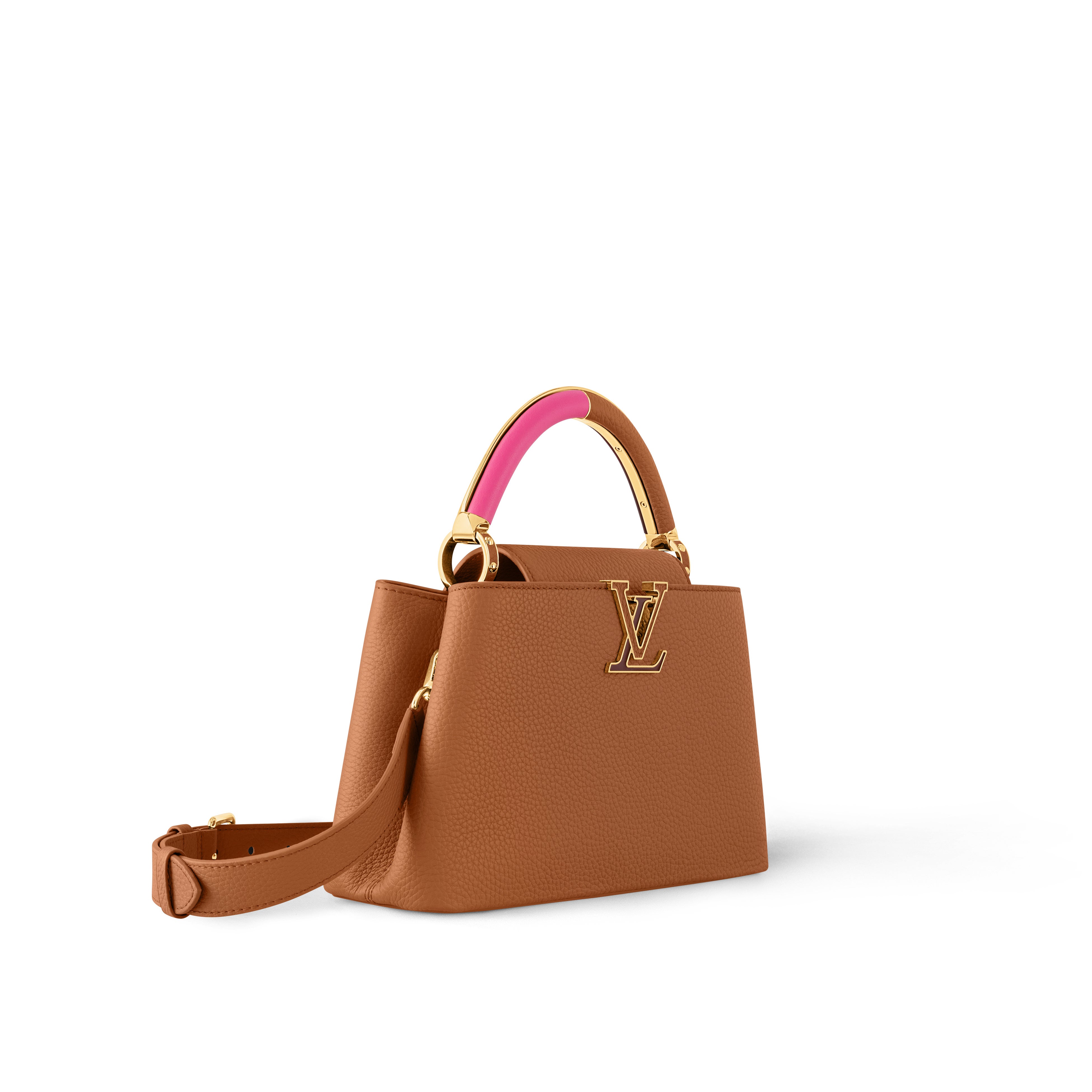 ルイ·ヴィトンは、4色のカラフルなレザーで構成されたこれまでにないハンドルが特徴の「カプシーヌ」の新作を発売しました。トリヨンレザーを使用し、メゾンの卓越したレザー加工技術で仕上げています。レザーで飾ったLV イニシャルの内側にはゴールドカラーのフレームをあしらい、華やかな雰囲気に。レザーにゴールドカラーのメタルパーツをあしらったツートーンカラーのLV イニシャルが、ラグジュアリーなクラフツマンシップを演出します。