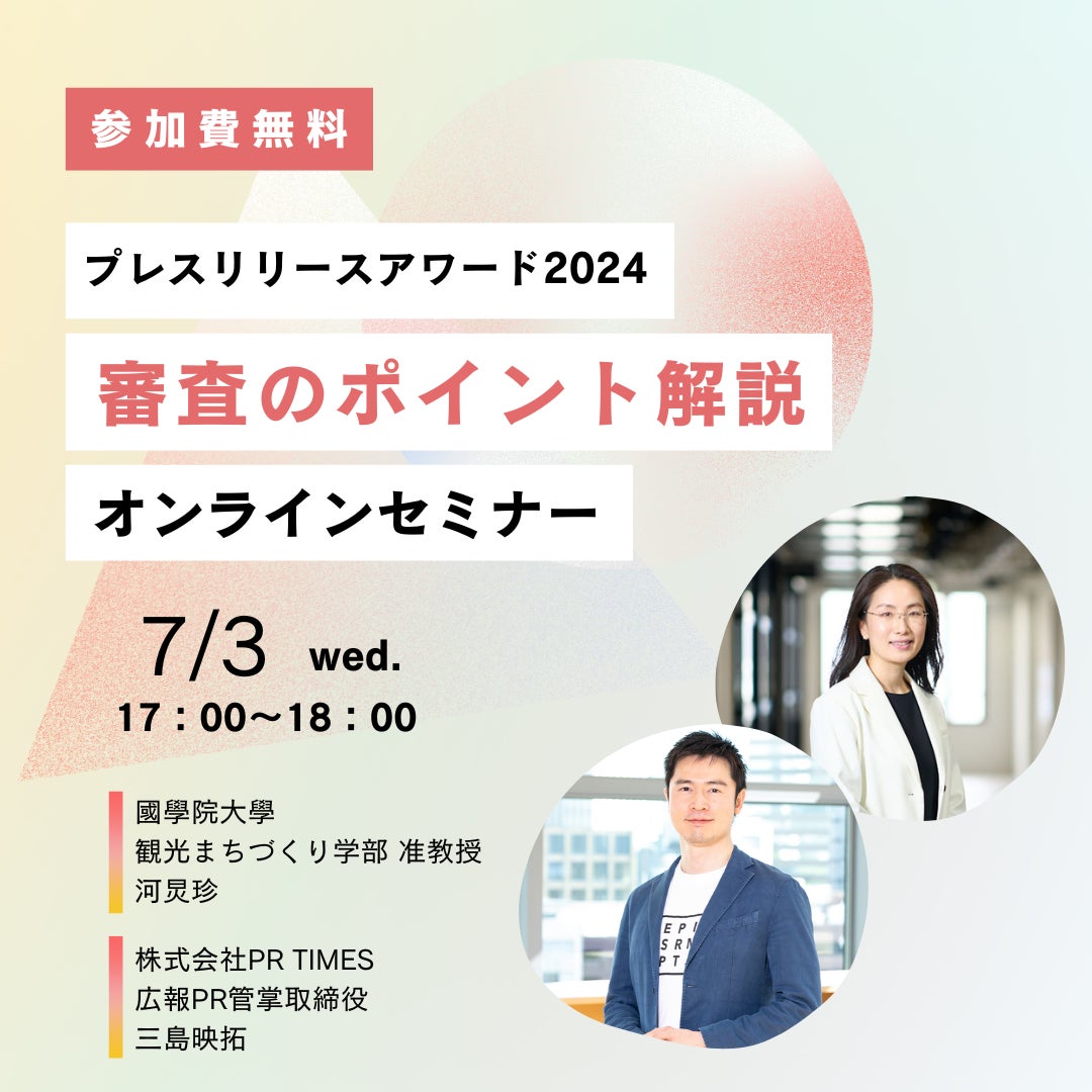 エントリー開始に伴い、プレスリリースアワード2024審査員に決定した國學院大学 河炅珍准教授、PR TIMES広報PR管掌取締役 三島映拓の2名が解説する審査のポイントセミナーを7月3日(水)17時より開催いたします(参加方法等は後述します)。
