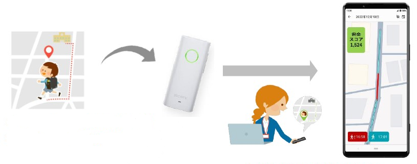 ソニーネットワークコミュニケーションズ株式会社のみまもりサービス「amue link(アミューリンク)」※3用の見守りGPS端末※4をベースにした専用端末を、登下校中などの児童に携帯してもらい、専用端末が飛び出しやふらつきなど児童の危険な動きを検知します。検知された動きを保護者がスマートフォンで確認し、事故に遭いにくい安全な歩き方や振る舞いを児童に効率的に指導することで、児童の安全学習に寄与するかを検証します。
