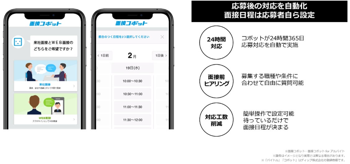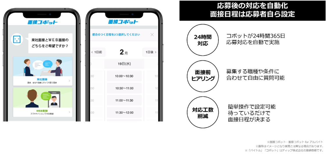 応募の取りこぼしを減少させ面接率・採用率を向上させるために、採用担当者に代わって応募受付から面接日時の設定までの採用プロセスを24時間365日、自動で対応するサービス「面接コボット」がセットになりました。手間と時間のかかる採用プロセスを自動化することで、さらなる面接率・採用率の向上を目指します。