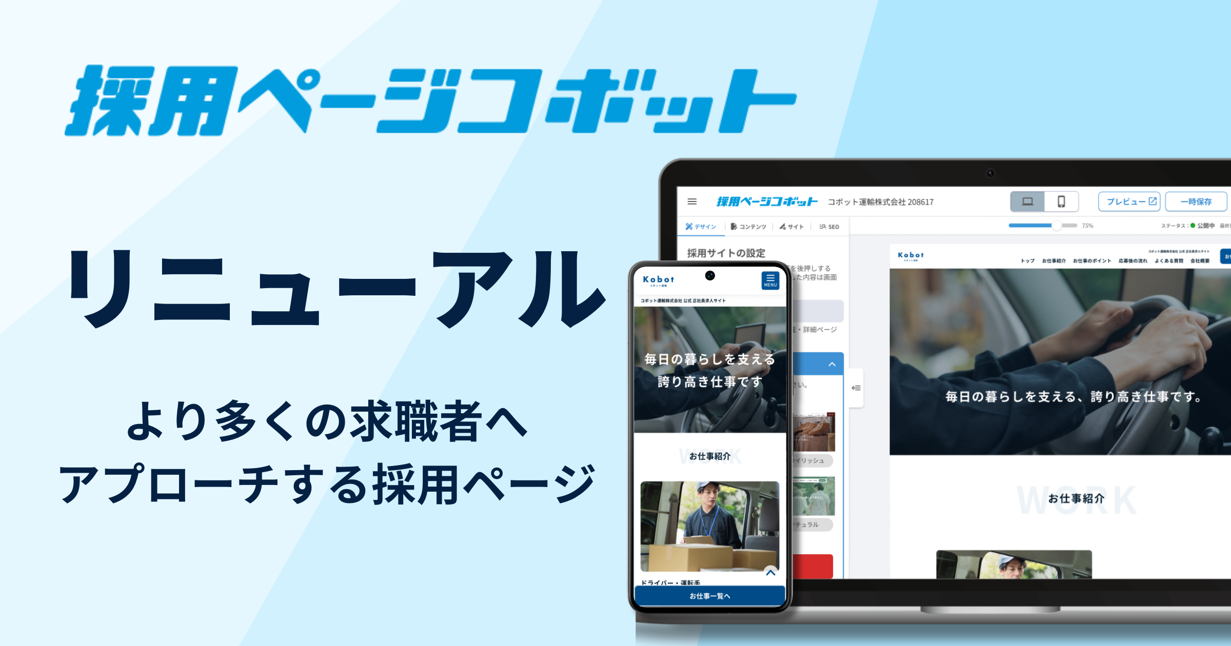 この度のリニューアルでは、トップページ作成機能の搭載、応募対応の自動化、採用ページへのアクセス増加対策の強化など、既存機能の見直しに加え新たな機能を追加しました。これにより、企業と求職者のマッチング率を向上させ、企業の採用活動を支援してまいります。
