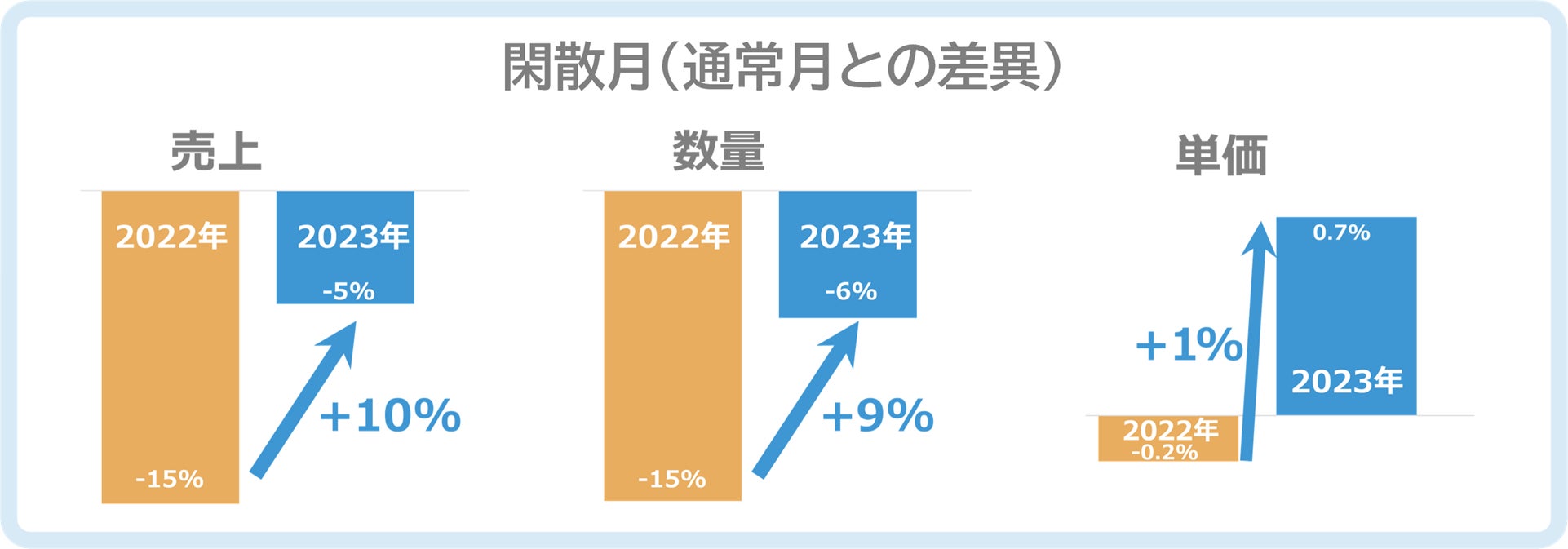 施策を実施した7月のBiblio Café全体の売上・販売数量・平均単価は、前年同月比および閑散月と通常月との差異のいずれも改善し、売上は前年同月比で6%アップ、換算月と通常月の差異は10%改善が見られました。