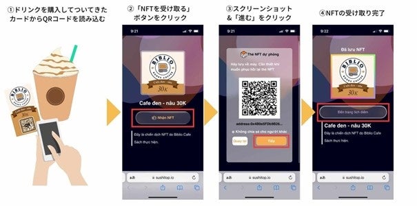 実証実験では、BiblioCafeの公式Facebookと、店頭で合わせて6種類のNFTを配布しました。公式Facebookからは先着500名のお客様へ1種類のNFTを配布し、そのNFTを取得したお客様が実際にカフェに来店するとドリンクが無料で提供されます。さらに、カフェでドリンクを購入したお客様へは、購入したドリンクに応じて、NFTを受け取るためのカードを進呈します。そのカードでスタンプラリーページにアクセスし、NFTを集めていくと、次回のご利用時にドリンクを無料で提供を受けることができます。購入したお客様に進呈するカードには、一回しかNFTを発行できないSUSHI TOP MARKETING株式会社の「NFT One Shot」という知財を使いカードに印刷されたQRコードを読み取ることでNFTを取得します。
