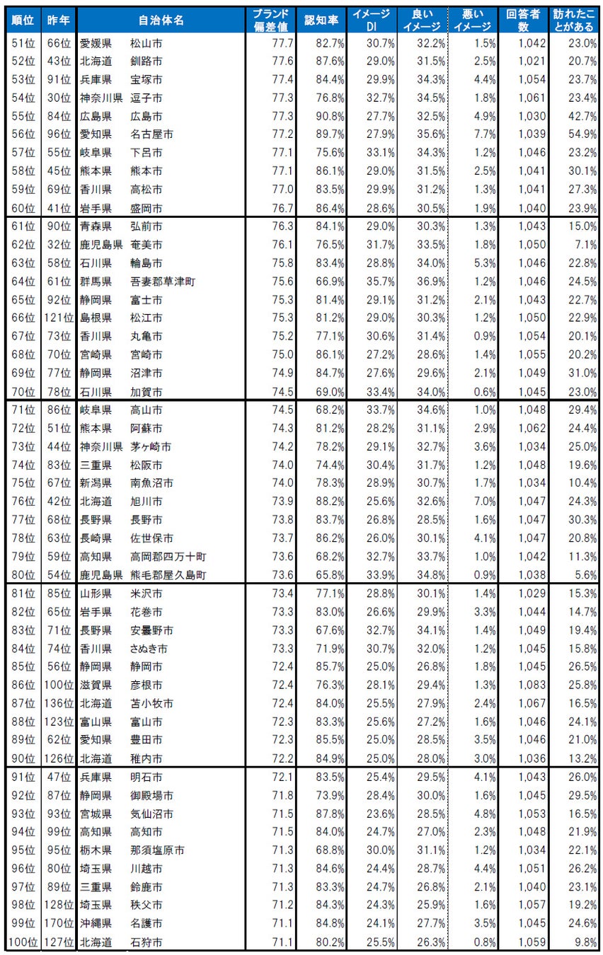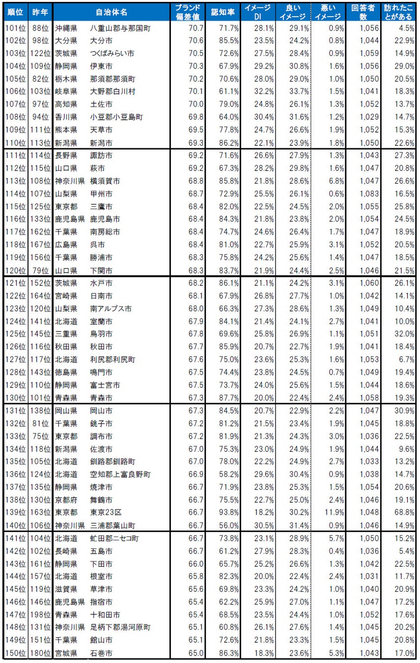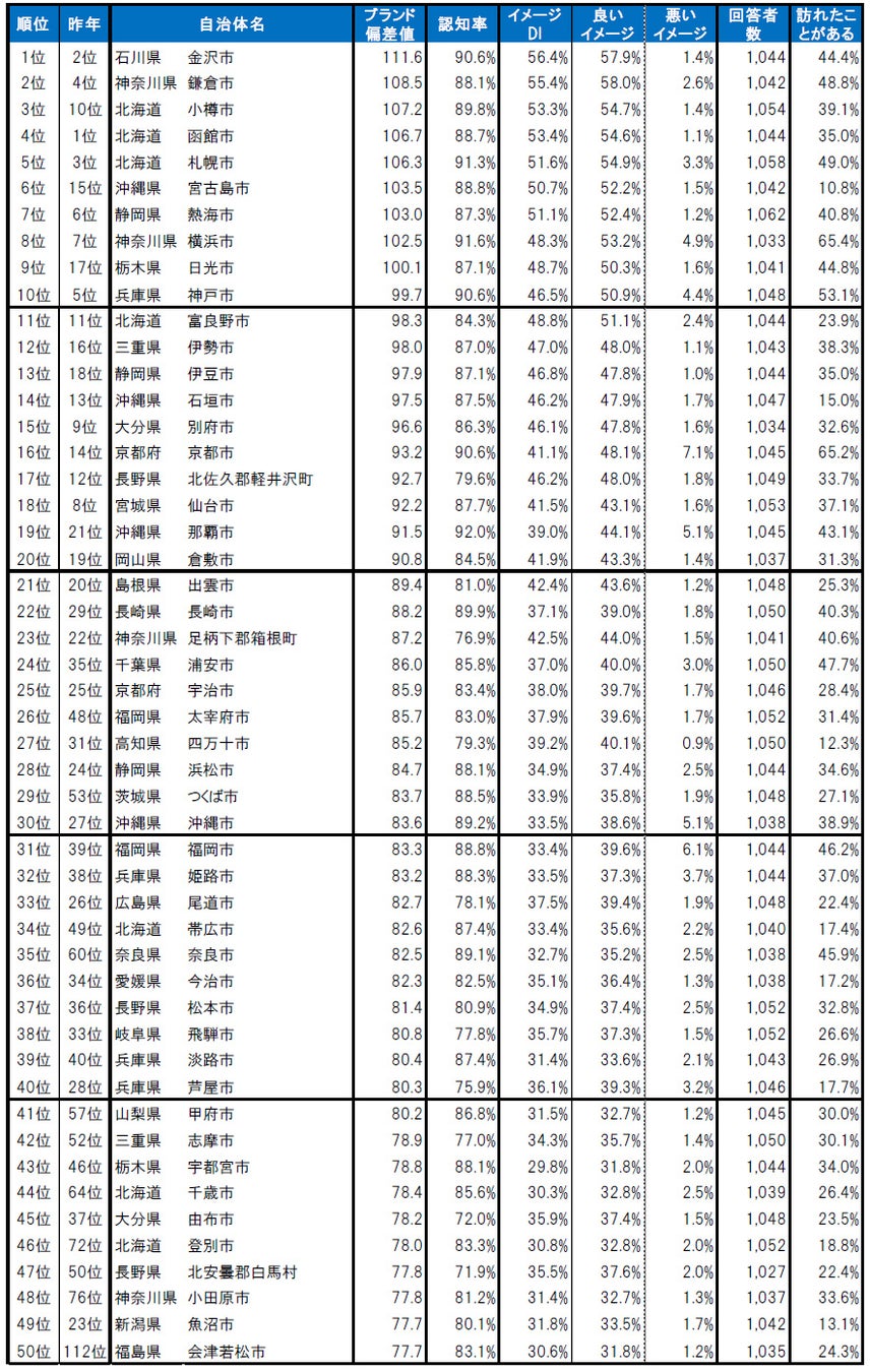 1位は石川県金沢市、2位は神奈川県鎌倉市、3位は北海道小樽市、4位は北海道函館市、5位は北海道札幌市など、観光地として有名な自治体が今年も上位にランクインしており、そのうち3つは北海道の自治体となっています。トップ10内では、6位沖縄県宮古島市(昨年15位)、9位栃木県日光市(昨年17位)が、昨年より順位を上げてトップ10入りしています。トップ10の自治体に対する認知率は90%前後と非常に高く、イメージDIは40~50%と非常に高くなっています。一方で、100位以下の自治体でも認知率が90%近くある自治体もありますが、イメージDIが30%台を超える自治体はありません。また、ランキングとして公表はしていませんが 、イメージDIがマイナスの自治体もごく少数ですが存在します。