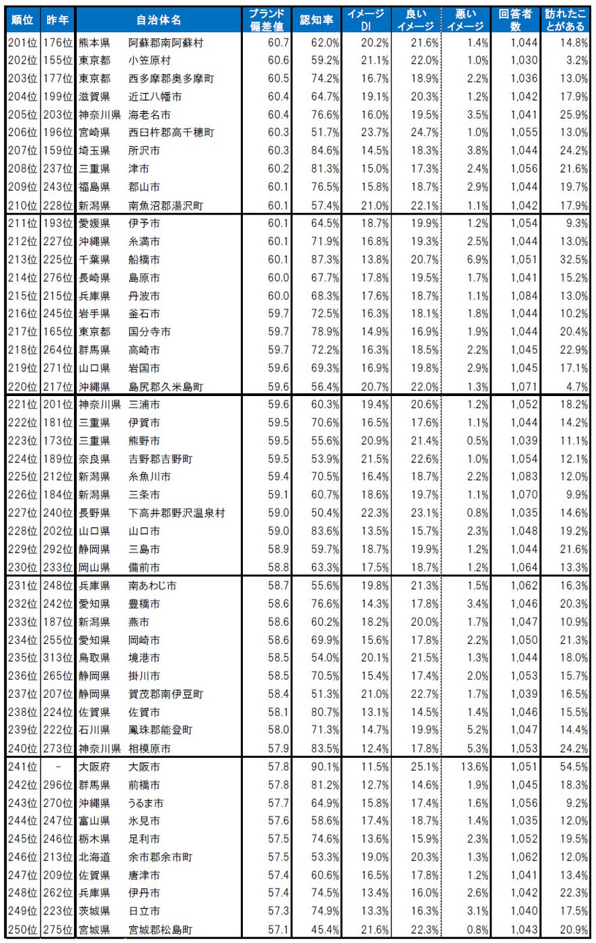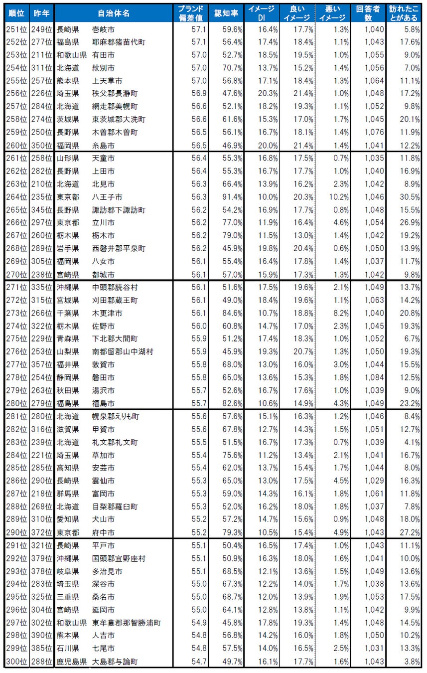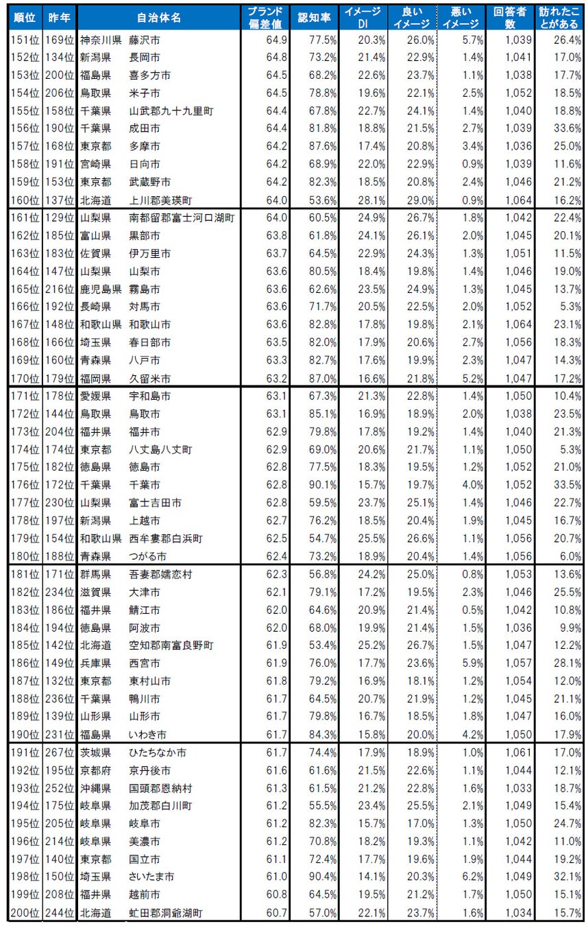 1位は石川県金沢市、2位は神奈川県鎌倉市、3位は北海道小樽市、4位は北海道函館市、5位は北海道札幌市など、観光地として有名な自治体が今年も上位にランクインしており、そのうち3つは北海道の自治体となっています。トップ10内では、6位沖縄県宮古島市(昨年15位)、9位栃木県日光市(昨年17位)が、昨年より順位を上げてトップ10入りしています。トップ10の自治体に対する認知率は90%前後と非常に高く、イメージDIは40~50%と非常に高くなっています。一方で、100位以下の自治体でも認知率が90%近くある自治体もありますが、イメージDIが30%台を超える自治体はありません。また、ランキングとして公表はしていませんが 、イメージDIがマイナスの自治体もごく少数ですが存在します。