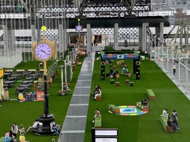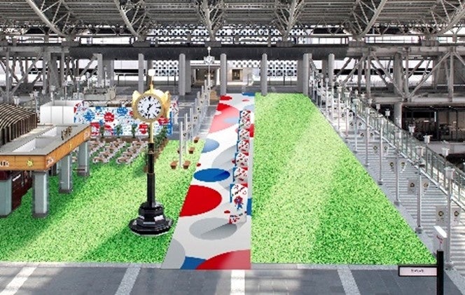 万博開催期間中、万博会場へのアクセス主要駅となる大阪駅を万博サテライト会場と位置づけ、時空の広場を中心に万博を想起させる装飾や出展ブースを設置し、既設の芝生やステージと一体となった空間を通して、より多くの国内外のお客様に万博を身近に感じていただく機会を創出します。