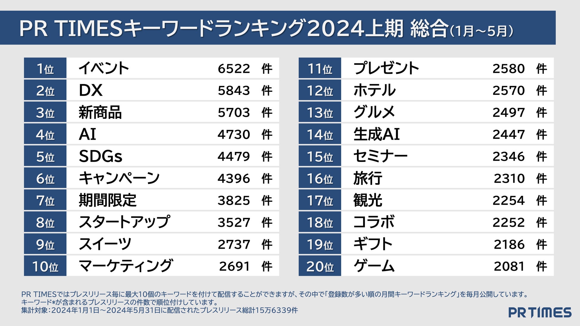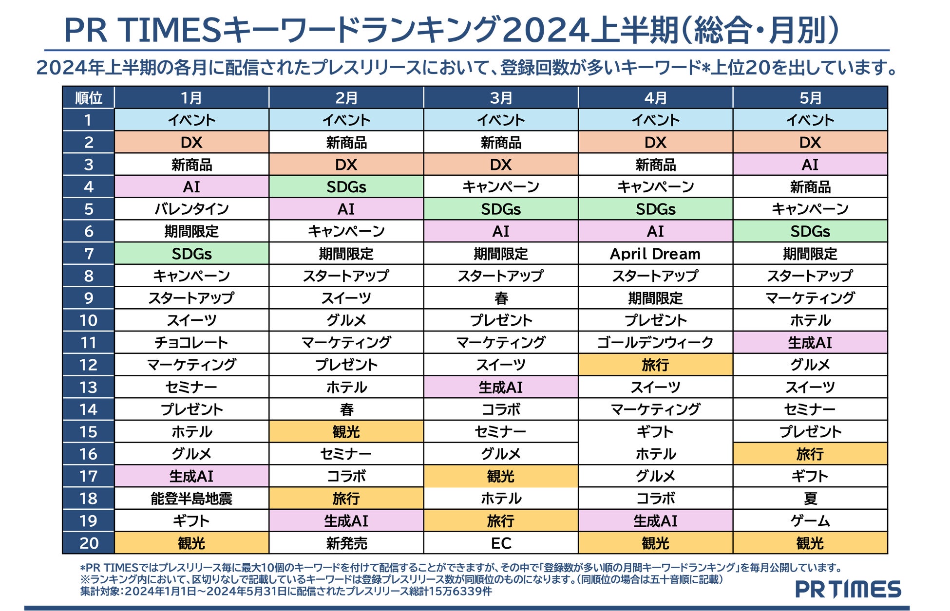 「PR TIMES」ではプレスリリース発表の際に、発表企業がプレスリリース内容に関係するキーワードを最大10個登録することができます。2024年1~5月に発表された総計15万6339件のプレスリリースのキーワード登録総数は24万3251種に上りました。総合ランキングでは2024年の企業活動の潮流を、そして月別ランキング推移からは企業動向の変遷と流行の兆しをキーワードを通して分析しています。