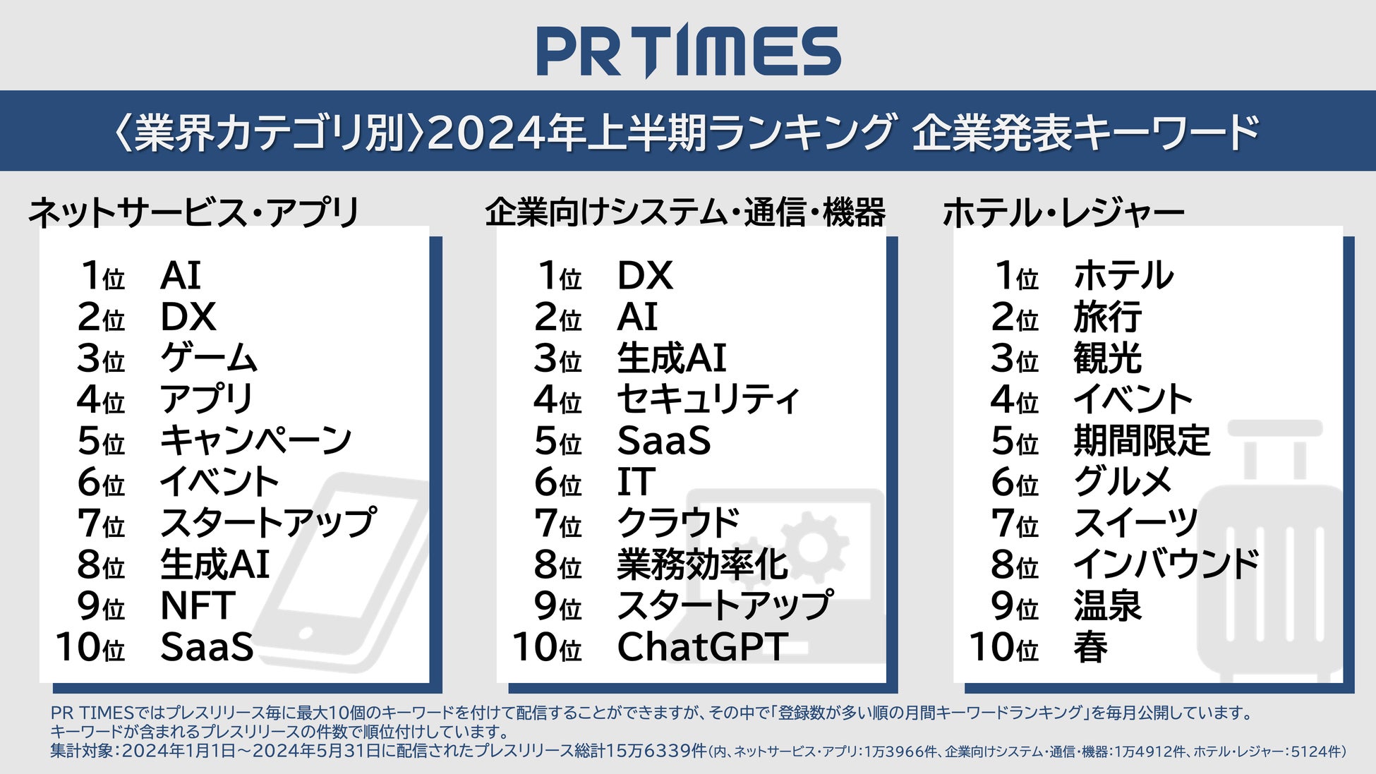 株式会社PR TIMES(本社:東京都港区、代表取締役:山口 拓己、東証プライム:3922)は2024年6月27日(木)、運営するプレスリリース配信サービス「PR TIMES」において、2024年1月1日〜2024年5月31日に企業から発表いただいたプレスリリース総計15万6339件を対象に、データ分析と総括、業界分析と各種ランキングなどを発表いたしました。