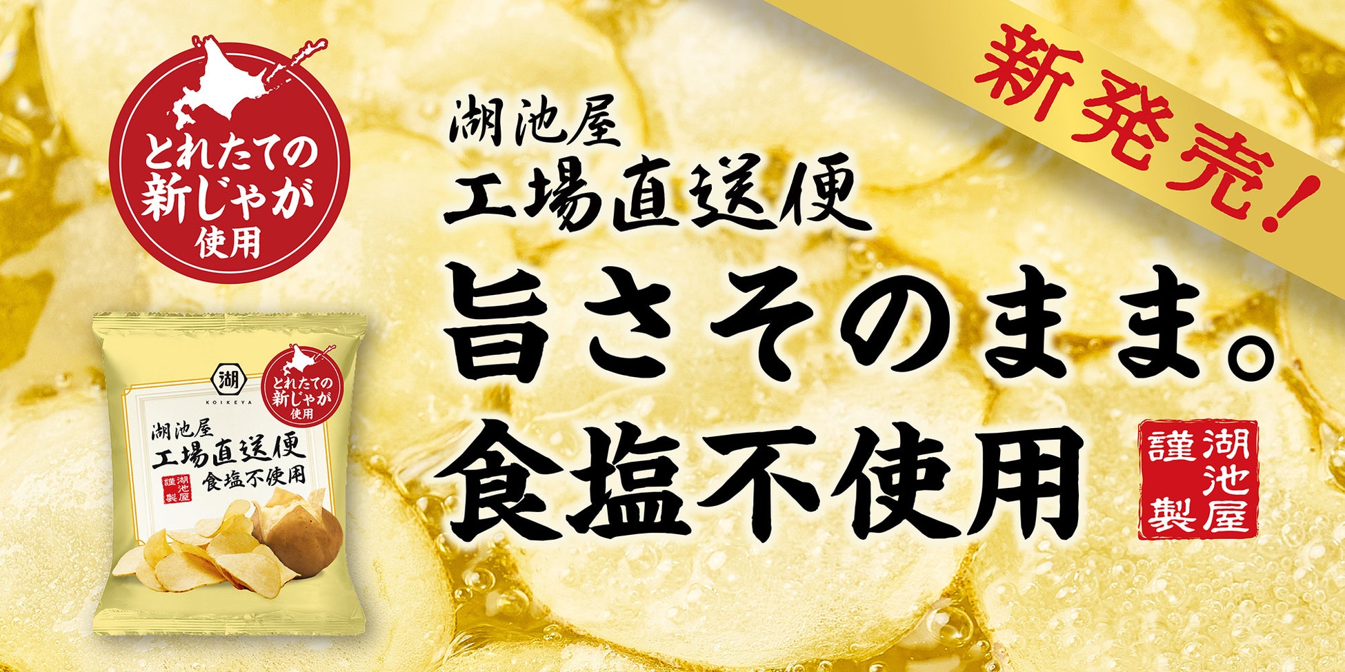株式会社湖池屋(社長:佐藤章)は、オンラインショップ限定商品としてご好評をいただいている「湖池屋 工場直送便 ポテトチップス」シリーズの新たな試みとして、あえて食塩を使わず、北海道産とれたて新じゃがの旨みを最大限に引き出した逸品「湖池屋 工場直送便ポテトチップス 食塩不使用」を、2024年8月29日(木)より、湖池屋オンラインショップにて受注販売を開始しました。