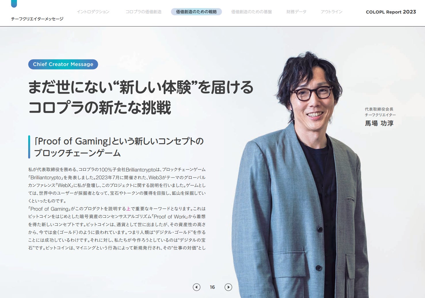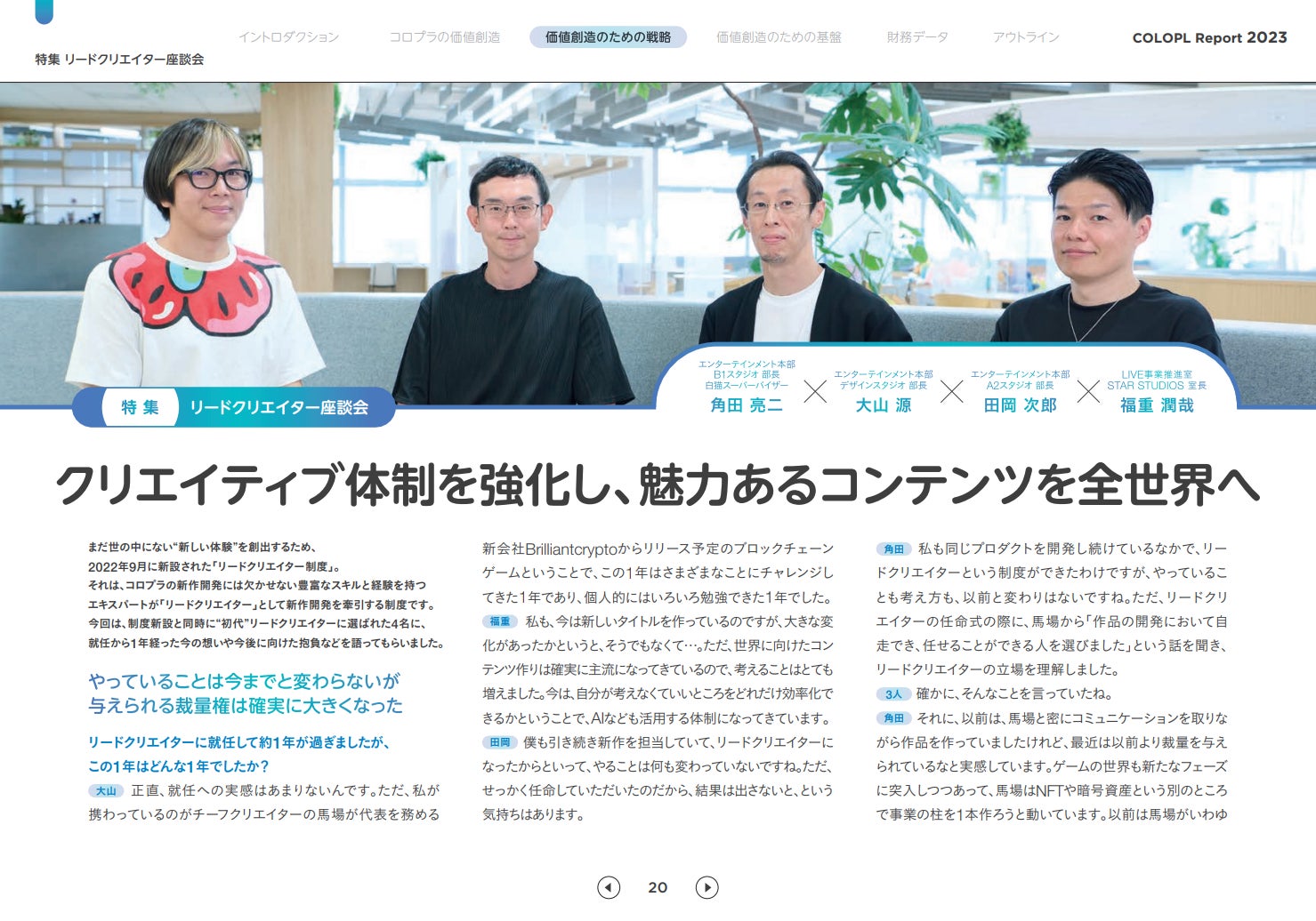 今回発行した「COLOPL Report 2023」では、「イノベーションを成長機会に」をキーメッセージとして、コロプラグループのこれまでの歩みや強み、代表取締役社長の宮本をはじめとする取締役メッセージ、リードクリエイターの座談会記事にて、コロプラとしての価値創造に向けた戦略等を説明しています。