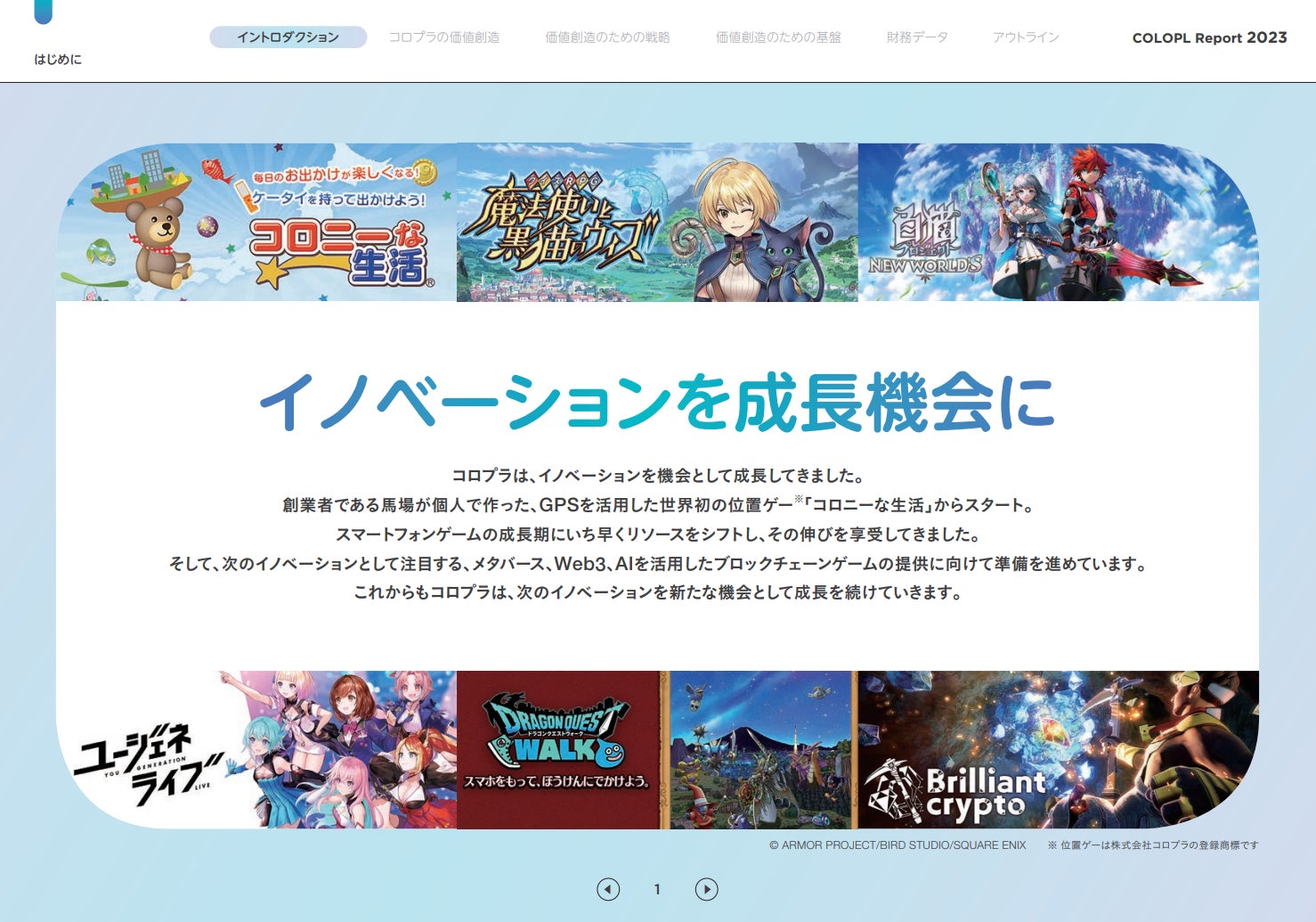 イントロダクションでは、新しいエンターテイメントを追求し、変化と挑戦で切り開いてきたコロプラのこれまでの歩みや、社風、強み、基本方針を改めて紹介しています。