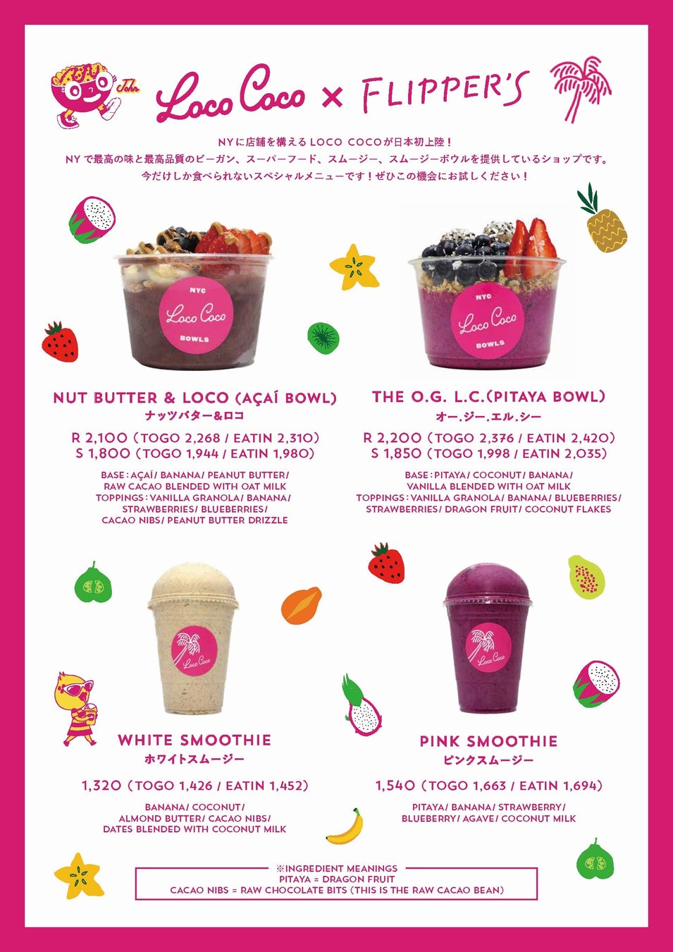 株式会社ベイクルーズ(本社: 東京都渋谷区、取締役CEO: 杉村 茂)が運営する、ブランチカフェ「FLIPPER’S」は、ニューヨーク発100%ヴィーガンスムージー&スムージーボウル専門店「LOCO COCO (ロコココ)」の期間限定店舗を、 2023年3月1日(水)「FLIPPER’S 渋谷店」内にオープンします。