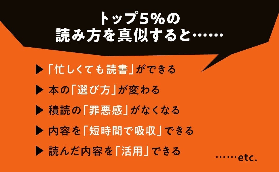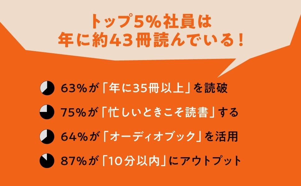 1万7000人のビジネスパーソンを分析した結果、トップ5%の社員は「時間がないからこそ」読書を習慣にし、仕事の成果を劇的に向上させていることが明らかになりました。一般のビジネスパーソンの読書量が年平均2.4冊であるのに比較し、トップ5%社員は年間43.2冊の本を読み、その知見を自分のものにして、アイデアを生み出し、仕事のパフォーマンスを加速させています。