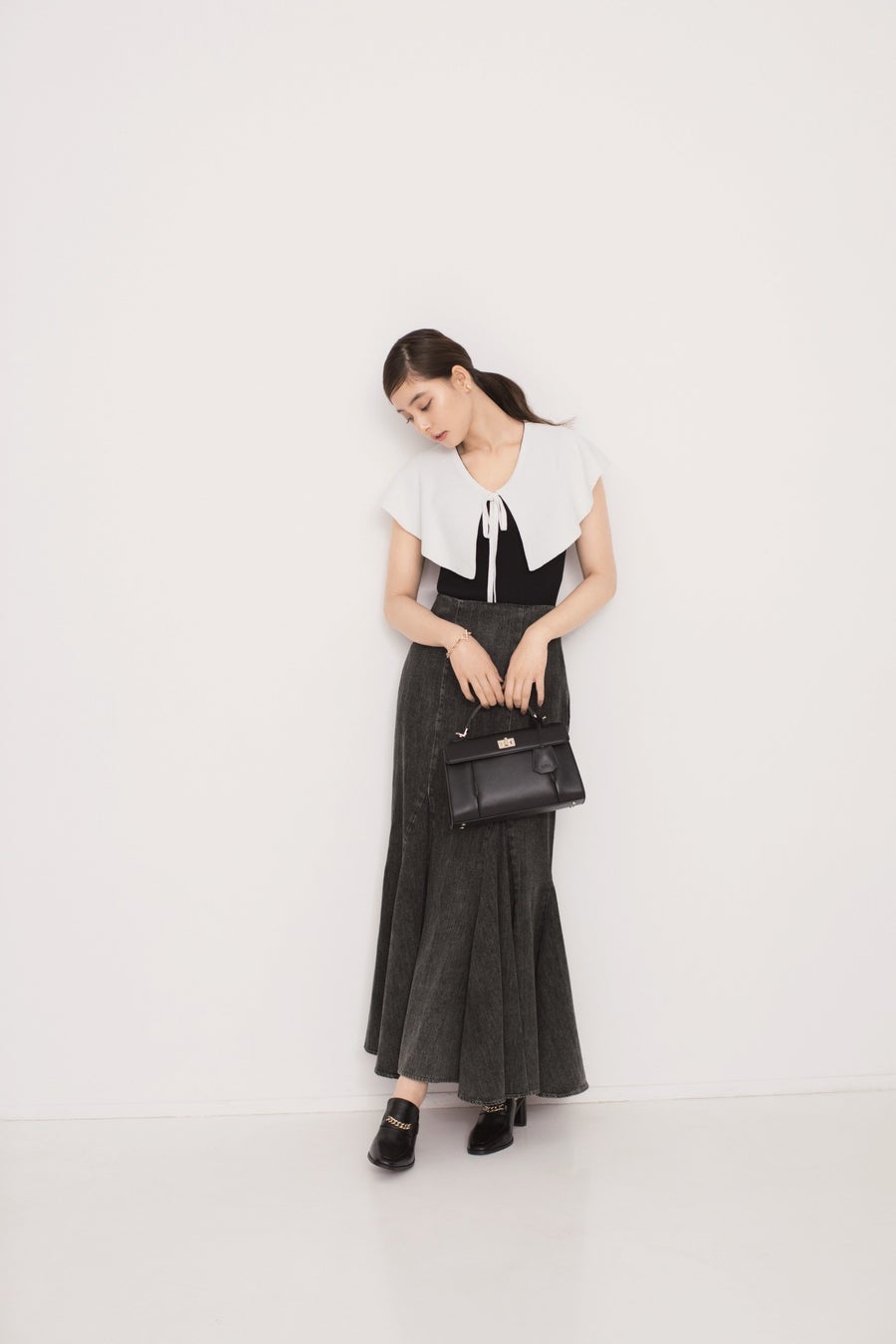 コットンのブラウスにツイード調のニットビスチェ、黒の微光沢のスカートを組み合わせたエレガントでモードな「SNIDEL」らしいコーディネートSETに仕上げました。