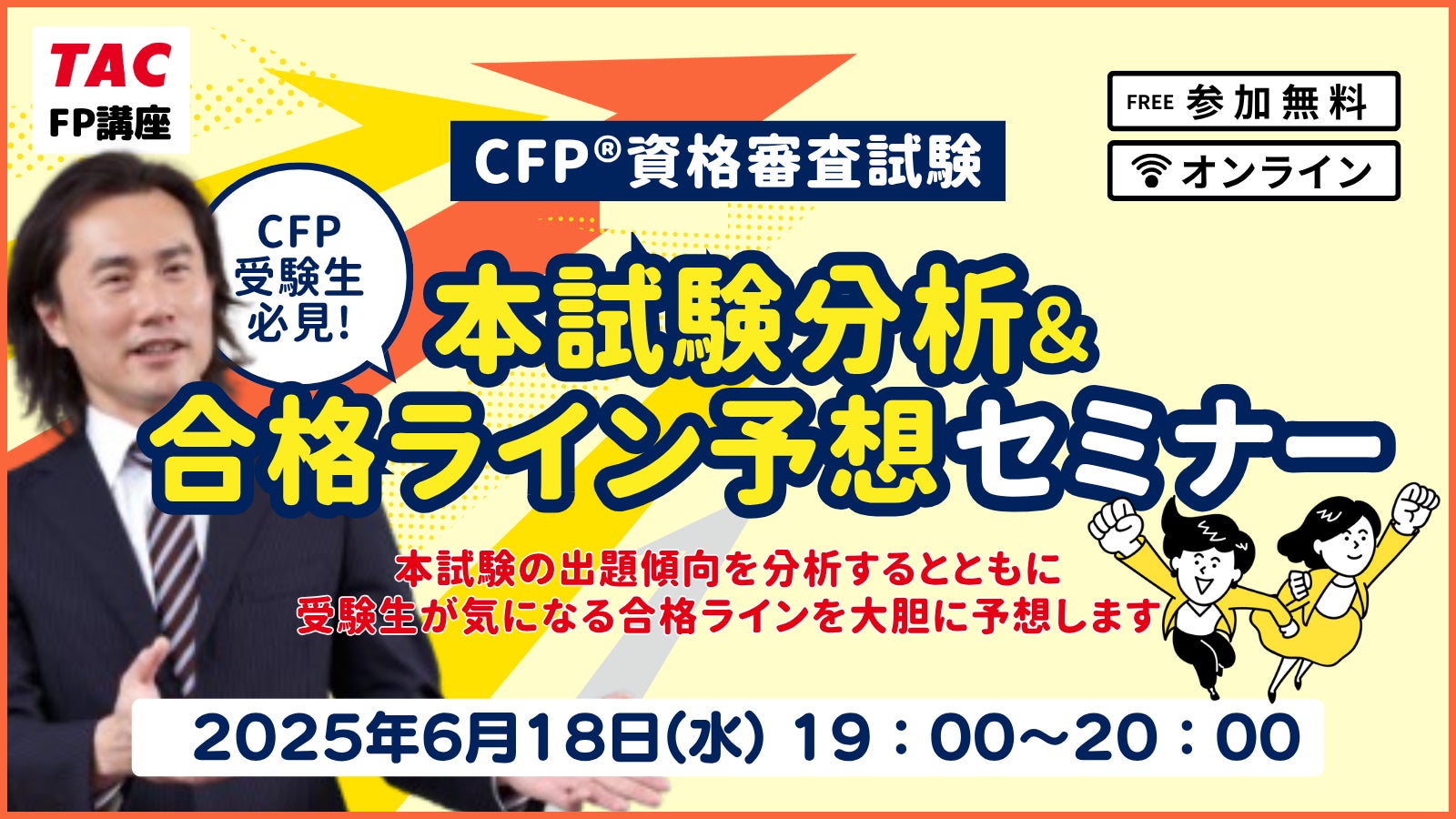ファイナンシャル・プランナー(以下、FP)、簿記検定試験、税理士、公認会計士などの資格取得に向けた教育サービスを展開しているTAC株式会社(東京都千代田区、代表取締役社長:多田 敏男)は、6/8(日)・6/15(日)実施の2025年度第1回CFP®資格審査試験の「本試験分析&合格ライン予想セミナー」を6/18(水)に実施します。受験生はもちろん、これからCFP®への挑戦を検討中の方も参加可能です。ベテラン講師の徹底分析が聞けるセミナーは資格学校TACならでは。簡単に参加登録できますので、お気軽にご参加ください。