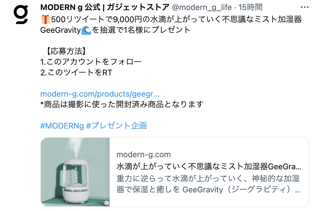 【9,000円の水滴が上がっていく不思議なミスト加湿器GeeGravityを抽選で1名様にプレゼント】MODERN gの公式Twitterで毎日ギブアウェイキャンペーン中!