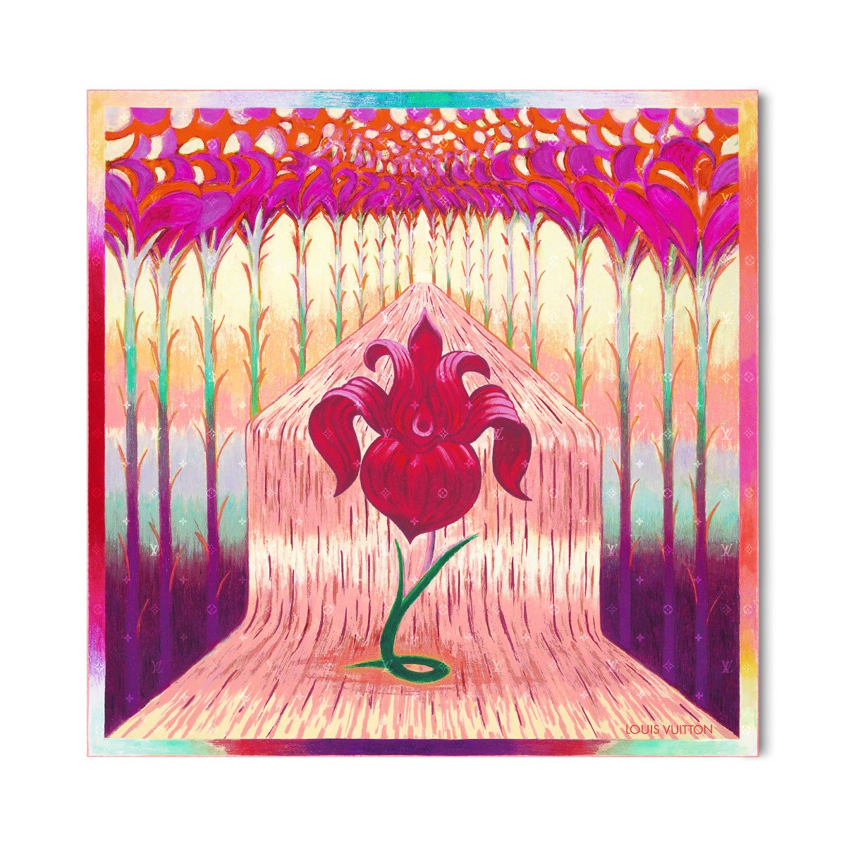 アーティストのロレンツォ·マトッティは色鉛筆とパステルを使用し、『Fires』や『Murmur』といった有名なコミックブックや、『New Yorker』や『Süddeutsche Zeitung 』に掲載されたイラストで、夢のような世界観を生み出しています。ルイ·ヴィトンのカレ「Iris Spring」は、メゾンのアニエールのアトリエ内にある歴史的なヴィトン家の邸宅の美しいアールヌーヴォー様式のステンドグラスに描かれた花へのオマージュ。多彩な木々や滝が完璧なフレームとなり、アイリスの流れるようなフォルムが、万華鏡のように素晴らしいファンタジーの中心的存在となっています。