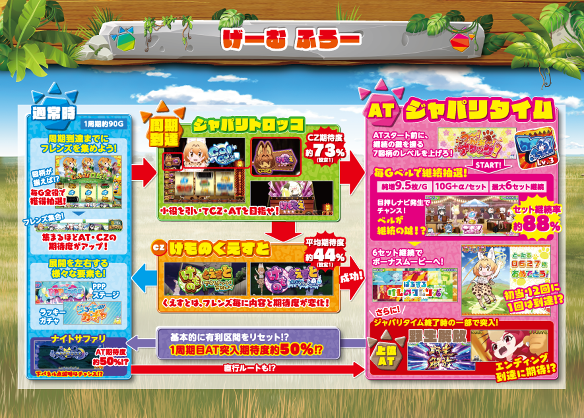 さらに、サミー株式会社の名機「獣王」シリーズからライオン、ダチョウ、ゴリラ、ゾウ、キリン、シマウマが当機種オリジナルのフレンズとして登場!上位AT「野生解放」を目指して思いっきりプレイしよう!