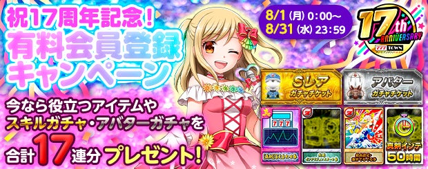 期間中に有料会員登録された方にアイテムや、スキルガチャ・アバターガチャを合計17連分プレゼント!