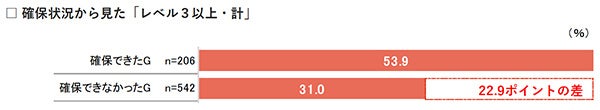 ■DX人材の確保が必要人数以上確保できたグループは、「行われていない」が1割強ではあるものの、レベル3以上は53.9%と半数以上。一方、確保できなかったグループ(少ない・計)を見ると、「行われていない」は16.4%で、レベル3以上は31.0%と3割台。