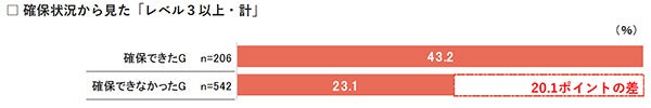 ■DX人材の確保状況で見ると、人材の確保が必要人数以上確保できたグループは、「明確になっていない」が1割強ではあるものの、レベル3以上は43.2%。一方、確保できなかったグループ(少ない・計)を見ると、「明確になっていない」が2割を超え、レベル3以上は23.1%と2割台。