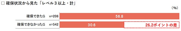 ■DX人材の確保ができなかったグループ(少ない・計)は、「取り組みが行われていない」が17.5%と、確保できたグループの9.2%より高い。レベル3以上を見ると、確保できたグループは56.8%と半数以上であるのに対して、確保できなかったグループは30.6%と大きく下回っている。